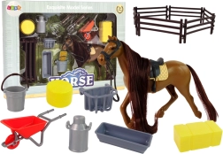 Този детайлно изработен комплект с кон предлага всичко, от което децата се нуждаят за игра на стойло и грижа за животни. Конят има красива грива, подходяща за ресане и сплитане на плитки, като не липсват седло и юзда. Включени са ограда, сено и практични инструменти за ежедневна грижа.
