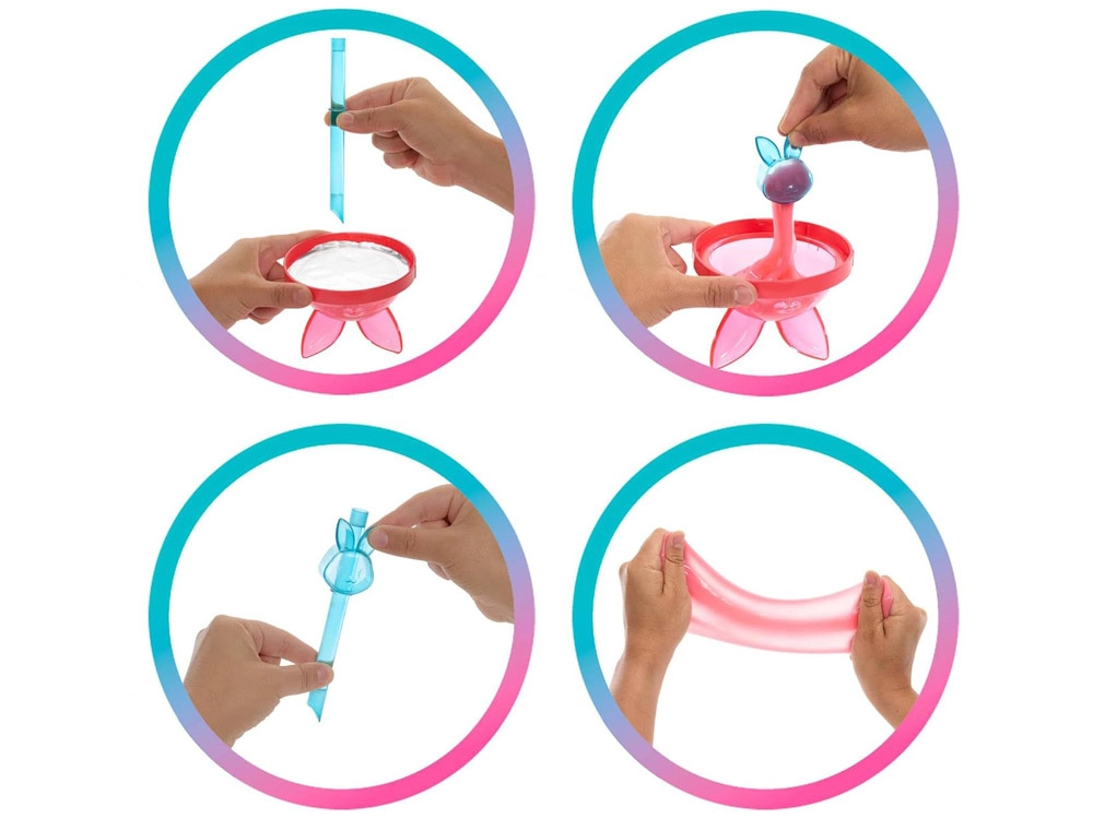 Разопаковайте цветната чашка с зайчешки ушички и открийте до 8 изненади, включително мек, еластичен и блестящ слайм за сетивна игра.