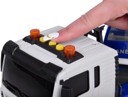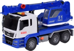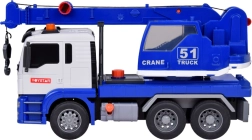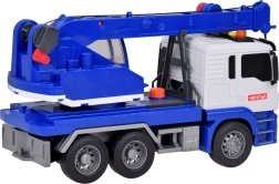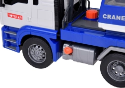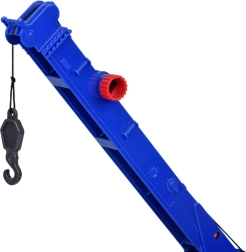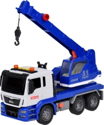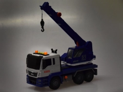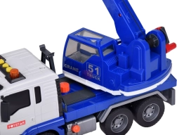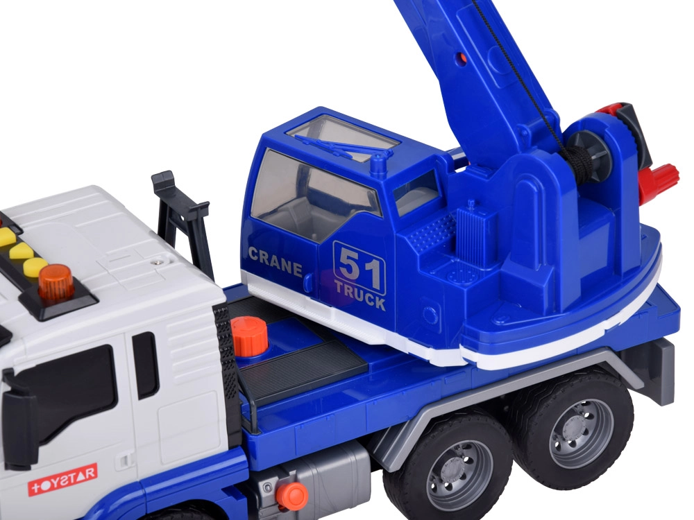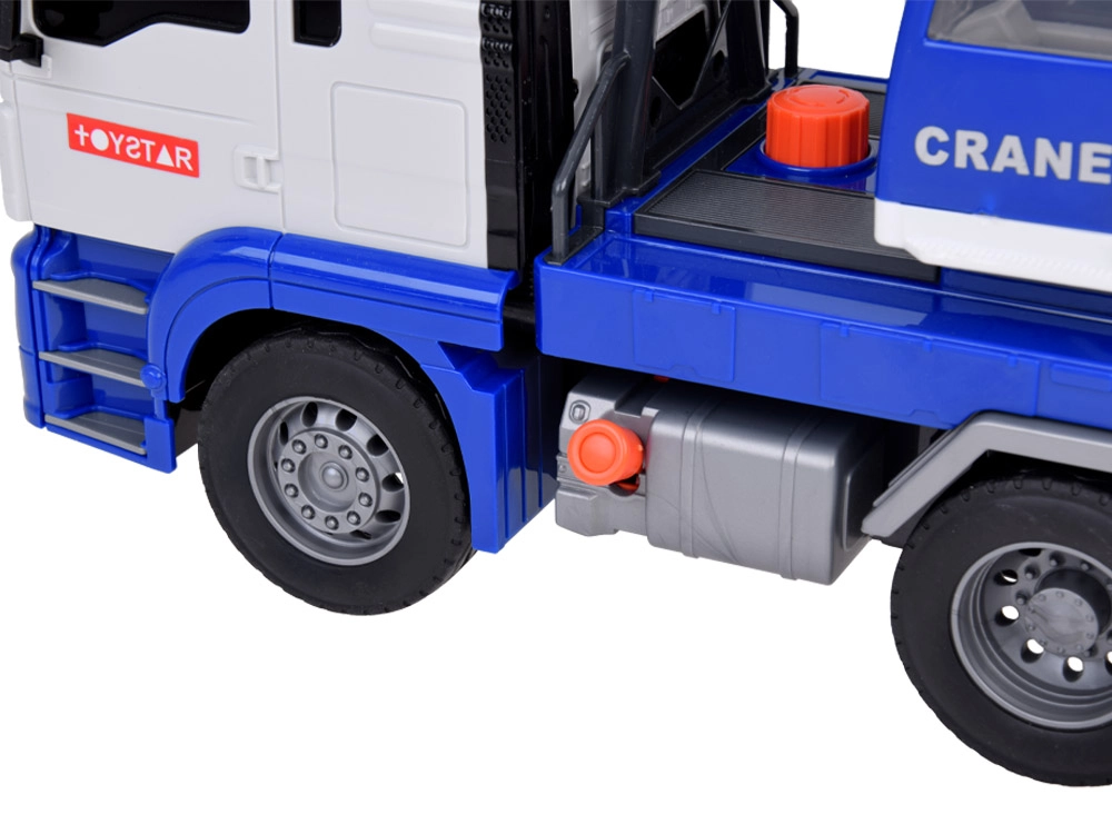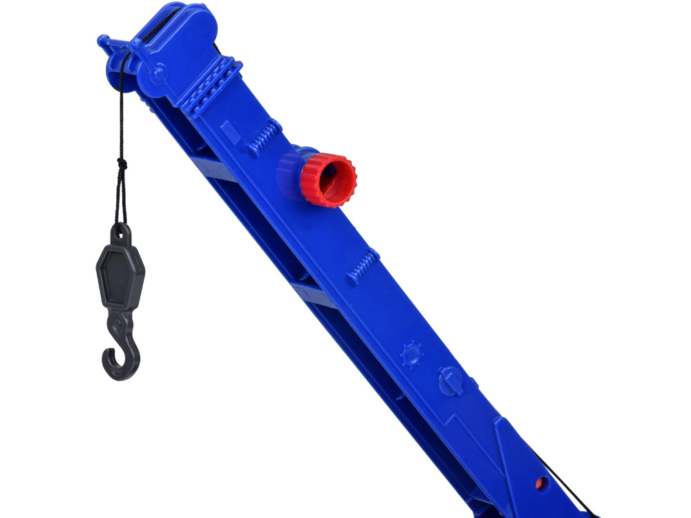 Този качествен автокран е проектиран за малки строители и предлага много реалистични функции. Той е оборудван с подвижна стрела с кука, която позволява повдигане и пренасяне на предмети, и звукови ефекти, които имитират запалване на двигателя, движение назад и клаксон.