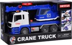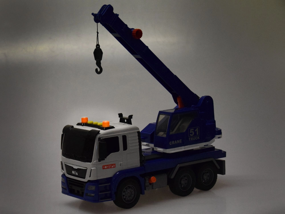 Автокранът има издръжлива пластмасова конструкция, която гарантира дълготрайност. Гумените гуми осигуряват отлично сцепление с повърхността и същевременно не надраскват пода. Благодарение на pull-back задвижването автокранът може да се движи напред след леко издърпване назад.