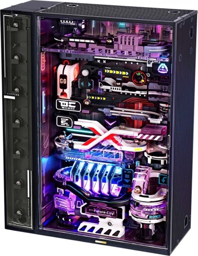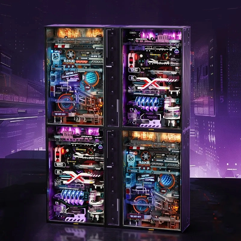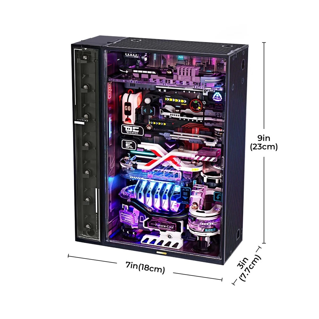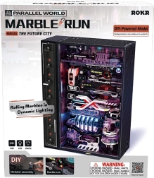 Създайте у дома пулсиращо sci‑fi панорама с бързи спускания между небостъргачи, тръбопроводи и фабрики. Автоматичният асансьор връща топчетата в стартова позиция, а неоновото LED осветление придава на сцената киберпънк атмосфера. С едно копче превключвате между „оживен ден“ и „цветна нощ“.