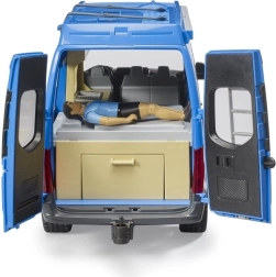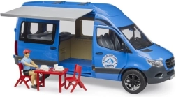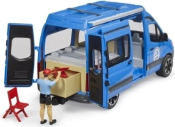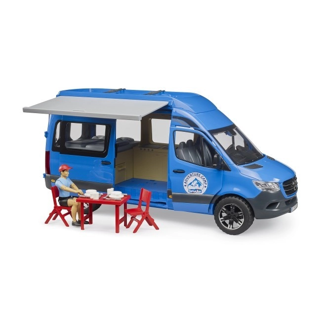 Отправете се на приключение с детайлно изработения кемпер BRUDER MB Sprinter, който предлага отворяеми врати, плъзгаща се странична врата, изтеглящ се тента и напълно оборудван интериор с двойно легло и кухненски кът. В комплекта са включени фигурка bworld и къмпинг комплект с маса, столове и съдове за реалистична игра. Произведен от висококачествен ABS в Германия.