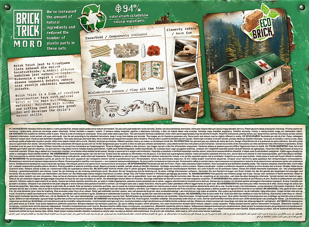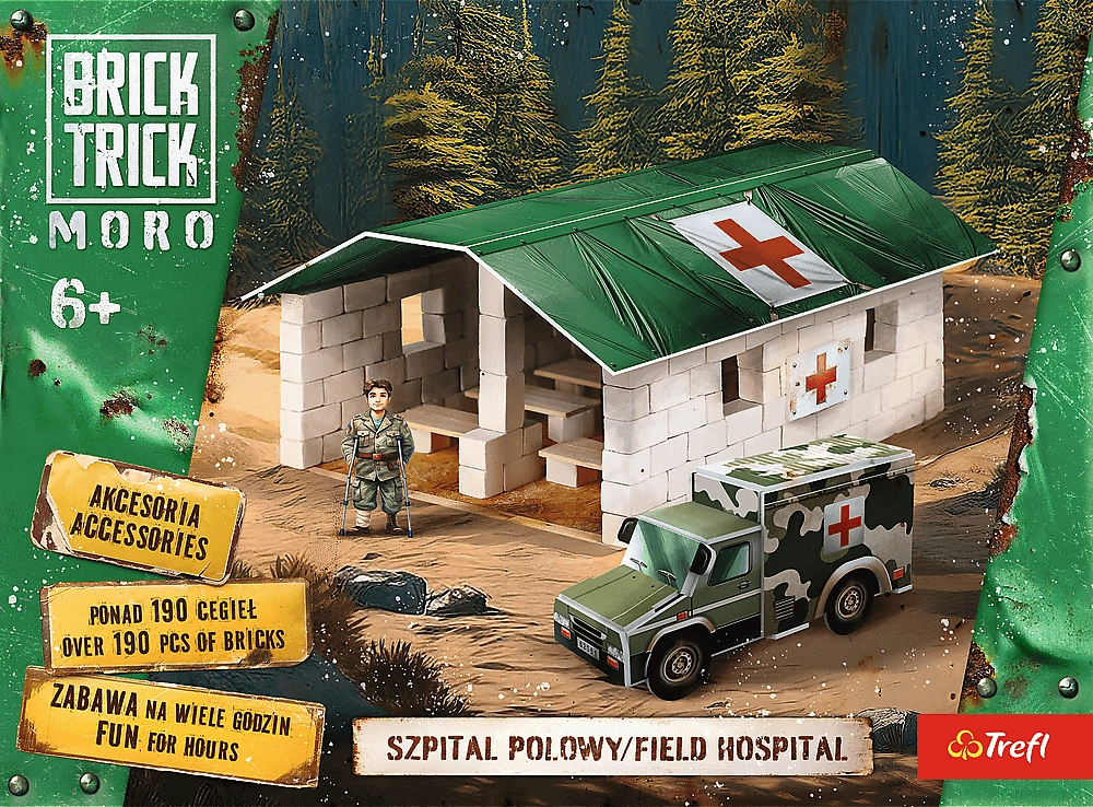 TREFL Brick Trick Moro: Полевa болница XL е уникален конструктор, който ви позволява да станете строител и да създадете своя собствена болница от реплики на истински строителни материали. Подреждайте тухла по тухла, режете и лепете дървени летвички и допълнете постройката си с декоративни елементи. Този комплект не само помага за развиване на сръчността, но и стимулира въображението и подпомага концентрацията.