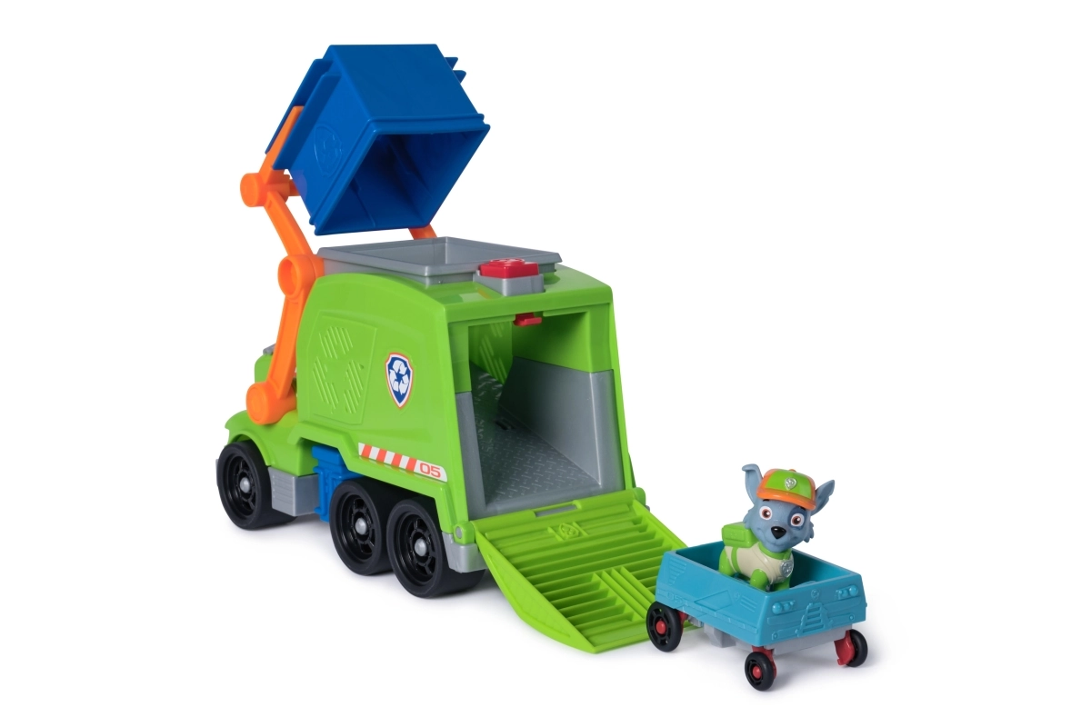 Този зелен сметосъбиращ камион с Роки носи страхотни рециклиращи приключения. Децата могат да поставят фигурката на шофьорската седалка, да захванат синия контейнер с предните вилици и с лост да го повдигнат за товарене. При натискане на бутона задната рампа се спуска и смачканото превозно средство се превръща в мини количка, на която Роки може да се вози.