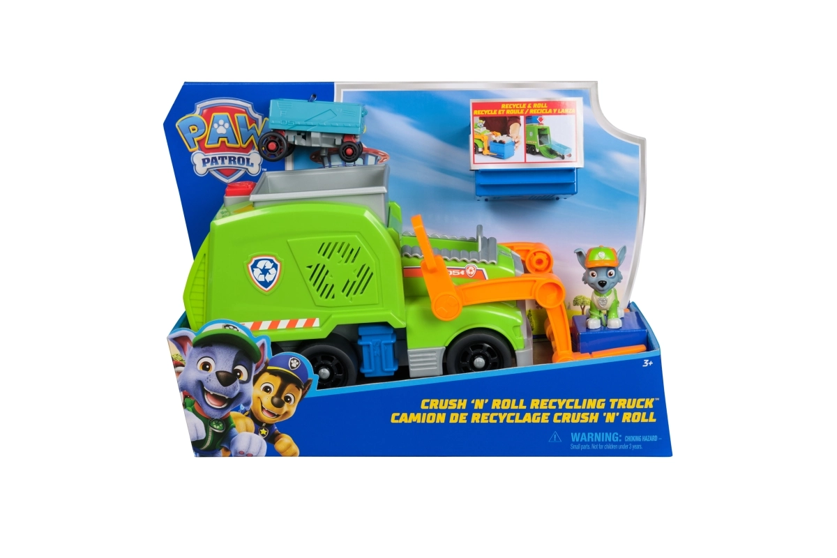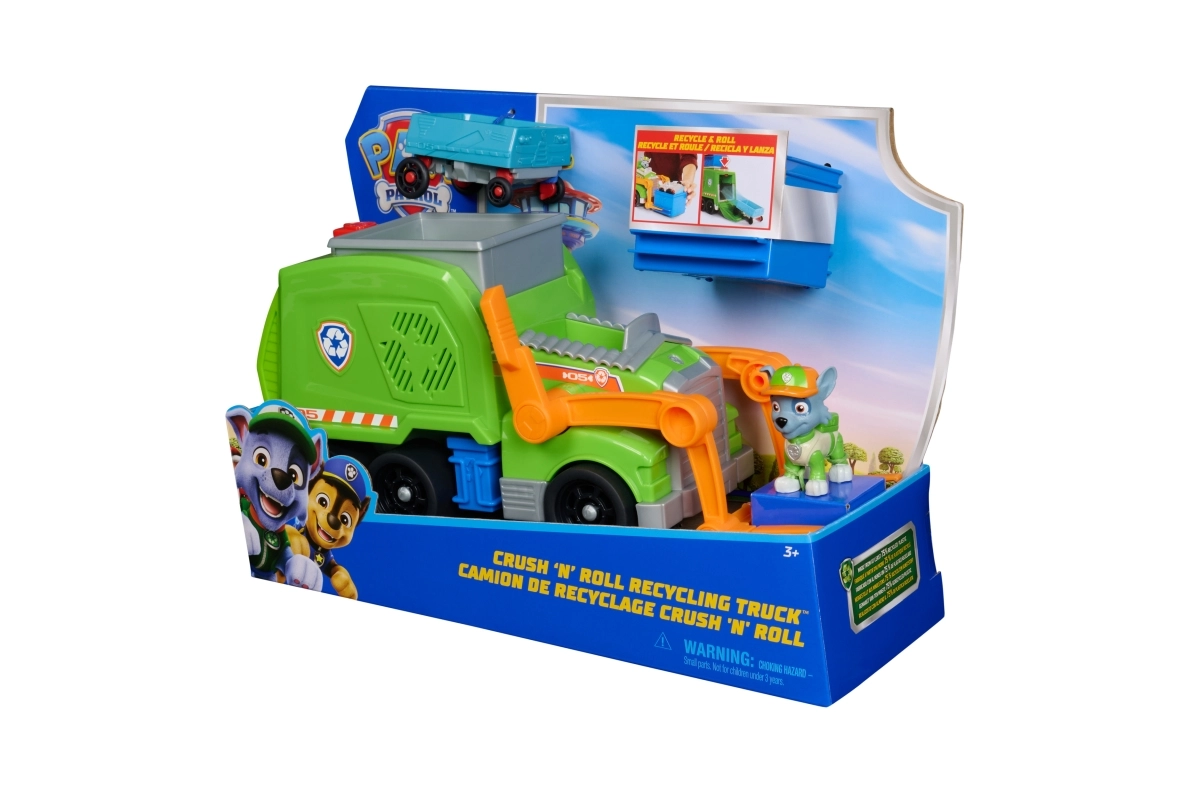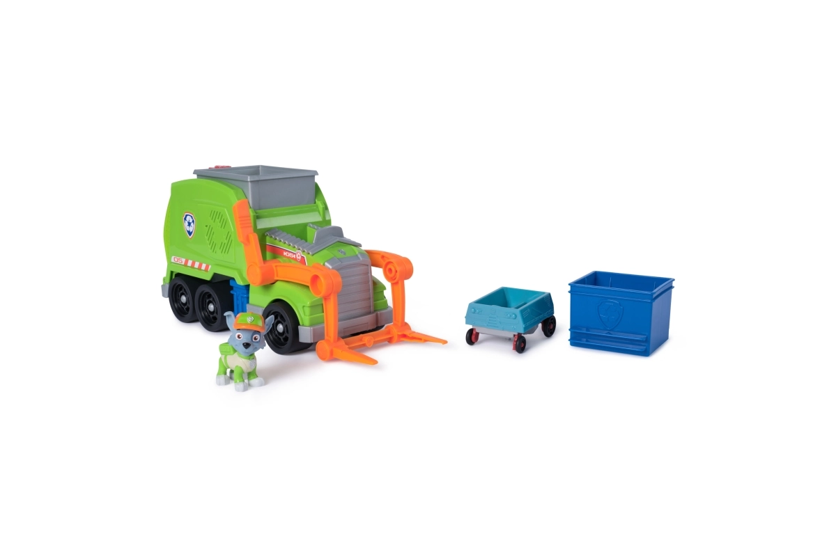 Отправете се на спасителна мисия с Роки и неговия рециклиращ камион, вдъхновен от сериала Пес патрул. Децата ще обикнат функционалните повдигащи вилици, подвижните части и възможността да превръщат смачканата кола в мини превозно средство. Играчката развива фината моторика, креативността и въображаемата игра.
