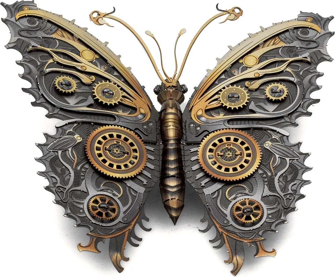Стиймпънк пеперудата METAL EARTH съчетава въображение и индустриален дизайн от викторианската ера. От плоски стоманени листчета постепенно се ражда пространствен модел с богата механична текстура, напомняща зъбни колела и механизми. Благодарение на лазерно гравираните детайли моделът изглежда автентично и се превръща в оригинална декорация и перфектен подарък за почитатели на стиимпънка и техническото изкуство.