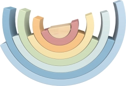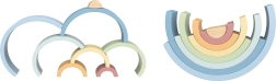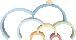 Комплектът съдържа 8 полукръгли елемента в различни размери и нежни цветове, които могат да се подреждат като дъга, мостове, тунели и фантазни конструкции.
