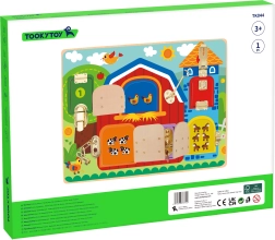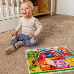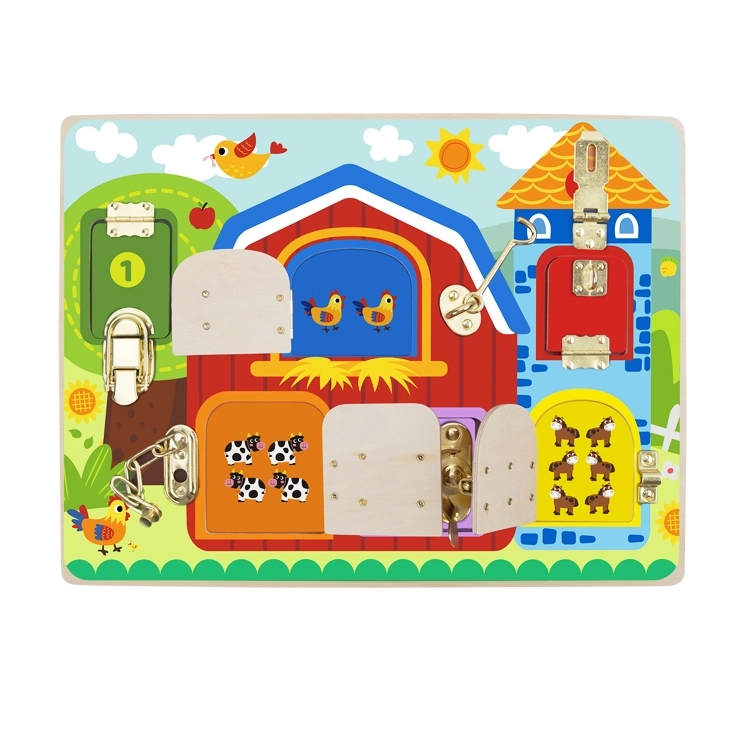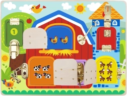 Тази качествена дървена табла предлага 6 прозорчета на панти с различни механизми – от класически резета до вериги и куки. Децата упражняват пръстите, концентрацията и търпението си, когато всеки механизъм отварят и затварят, за да открият сладки картинки на животни.
