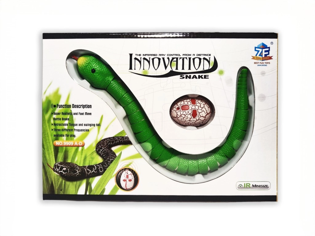 Реалистичната RC гърмяща змия носи доза забавление и смях както за деца, така и за възрастни. Движи се напред и настрани, има подвижен език и опашка, а благодарение на инфрачервено управление с обхват до 8 м реагира на всяка команда. В комплекта са включени презареждаща се батерия 3,7 V 500 mAh и контролер във формата на змийско яйце. Време за игра до 30 минути, четири цветови варианта, подходящо от 6 години.
