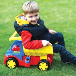 Детският самосвал Gigant 55 cm е голям товарен автомобил с дължина 55 cm, който децата ще обикнат заради възможността да товарят, разтоварват и превозват любимите си играчки. Оборудван е с преден и заден захват за прикачване на ремарке или въже за дърпане. Накланящата се каросерия с удобна дръжка позволява лесно управление и безкрайни игри. Благодарение на товароносимост до 150 kg самосвалът е идеален и като яздилка – най-малките могат да седнат върху играчката и да се оттласкват с крачета. Здравата конструкция осигурява издръжливост, което го прави идеален за игра както навън, така и вкъщи.