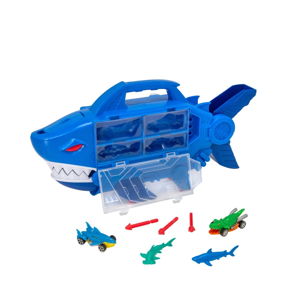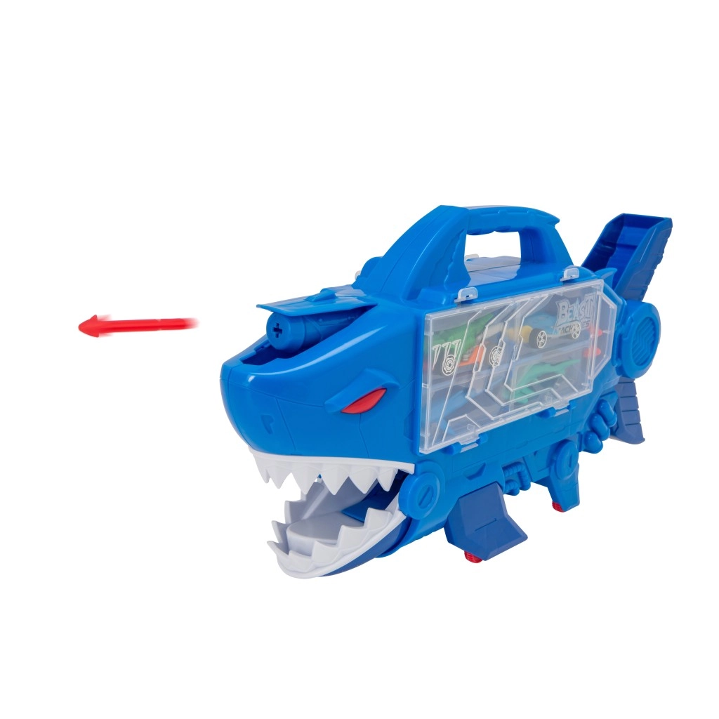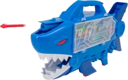 Наслади се на екшън каране с акуловото превозно средство TEAMSTERZ! Този оригинален носач и гараж в едно побира до 8 метални колички, има сгъваема вътрешна рампа, свободно въртящи се колела и практична дръжка. Натисни бутона и изстреляй снаряди от главата на акулата, мини през челюстите на акулата и се забавлявай по бързата писта. Страхотна играчка за развитие на фината моторика и въображението, подходяща от 3 години.