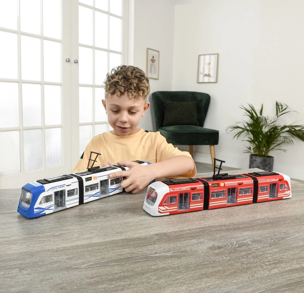 Трамваят се предлага в два цветови варианта – червен и син. Благодарение на включените 3× AAA батерии играчката е готова за употреба веднага, гарантирайки часове забавление за вашето дете. Подходяща за деца от 3 години.