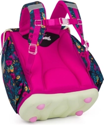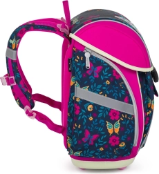 Училищният комплект premium light пеперуда комбинира стилен дизайн и внимание към здравословното носене. Олекотената раница с дишаща подплата на гърба, широки омекотени презрамки и гръден и стягащи ремъци разпределя тежестта равномерно. Благодарение на светлоотразителните елементи детето е по-видимо и при влошени условия.