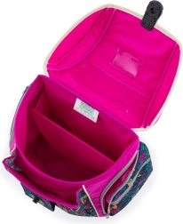 Умното вътрешно разпределение с разделител, голямото основно пространство и множеството джобове държат учебните принадлежности подредени на мястото им. Лесното магнитно закопчаване улеснява ежедневната употреба. Комплектът се допълва от практичен сак за спорт/чехли със стягане с връзки и едноетажен несесер с две капачета (без пълнеж) с гумени ластици и прозрачна джобна фолио за разписанието.
