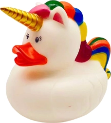 - Уникален дизайн – бяло патенце с дъгеста грива и опашка и рог на еднорог привлича вниманието от пръв поглед.