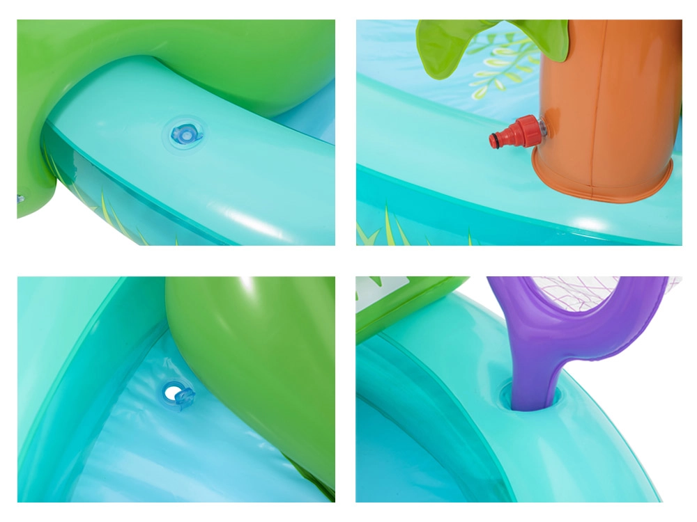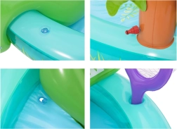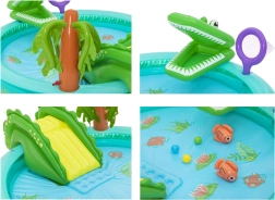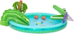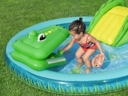 Надуваемият воден кът „крокодил“ ще донесе тропическо настроение в двора ви и множество активности, които ще занимават децата с часове. Нежната пързалка с меко приземяване е щадяща за малките откриватели, а пръскачката във форма на палма осигурява приятно разхлаждане в горещите дни. Здравото PVC и заоблените ръбове се грижат за безопасността по време на игра.