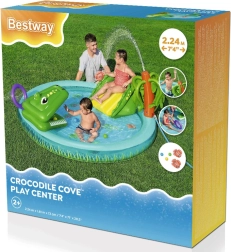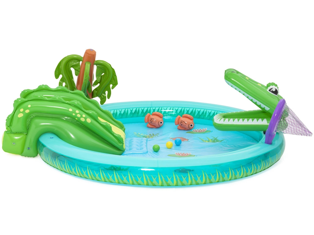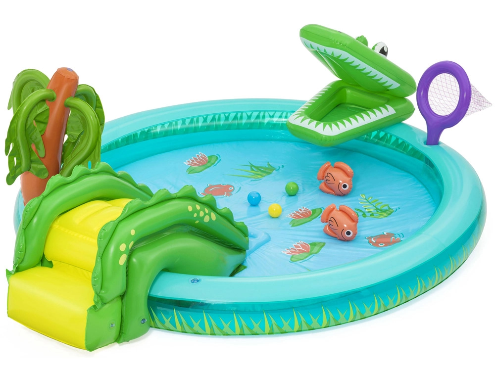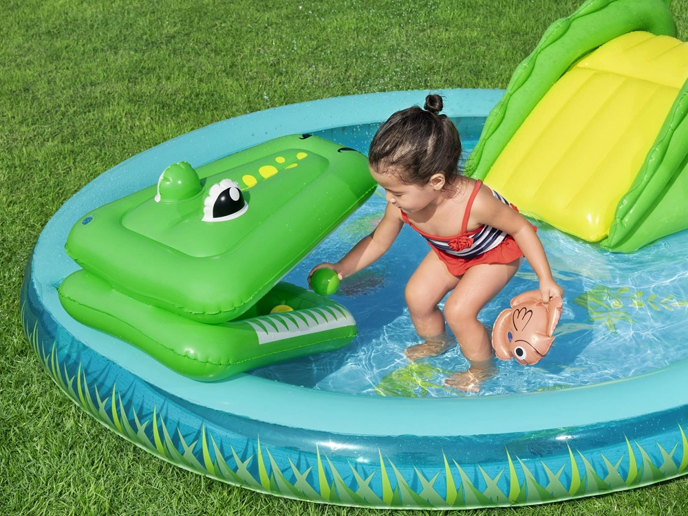 Подарете на децата лято, изпълнено със смях, с надуваемия воден кът в стил крокодил от BESTWAY. Този комплект съчетава пързалка с меко приземяване, пръскачка във форма на палма, която се свързва към маркуч, и забавни активности като хвърляне на топчета в устата на крокодила или улов на рибки. Просторният басейн с обем 210 л е идеален за деца от 2 години и предлага безопасно водно забавление в двора.