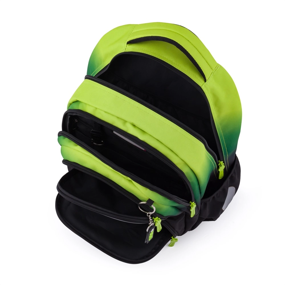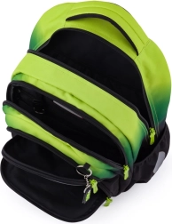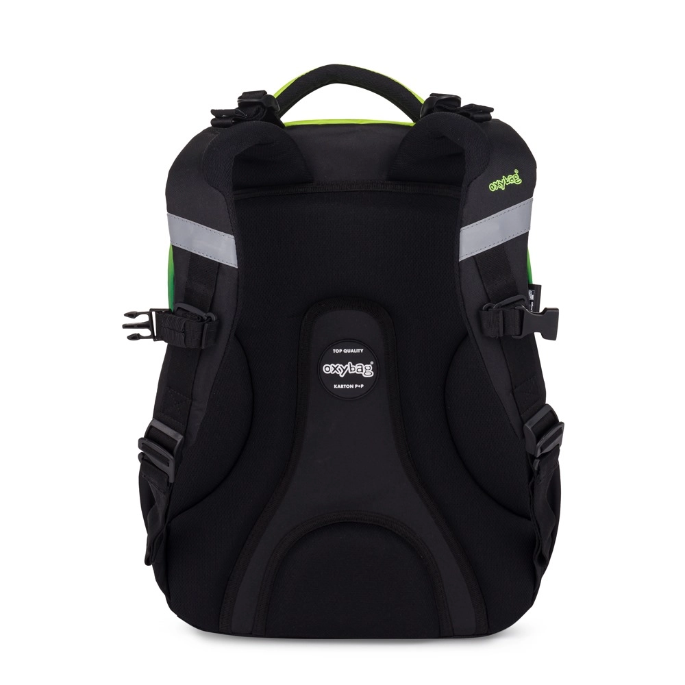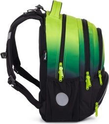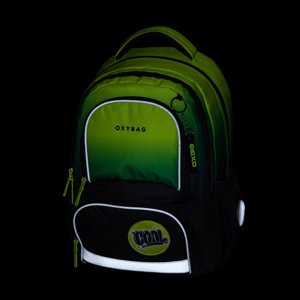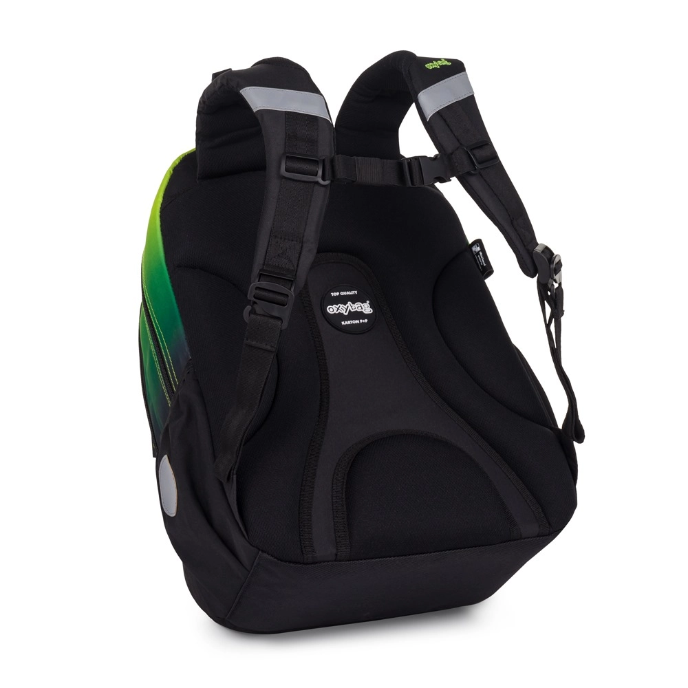 OXY NEXT Ombre е добре обмислена ученическа раница, която комбинира удобство, безопасност и практично разпределение. Благодарение на ергономичния гръбен панел (42 cm) и подплатените, регулируеми раменни презрамки с гръден колан се носи комфортно дори при пълно натоварване. Светлоотразителните елементи по периферията на раницата повишават видимостта на децата по здрач и при лошо време.