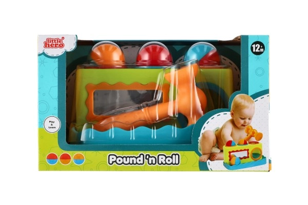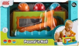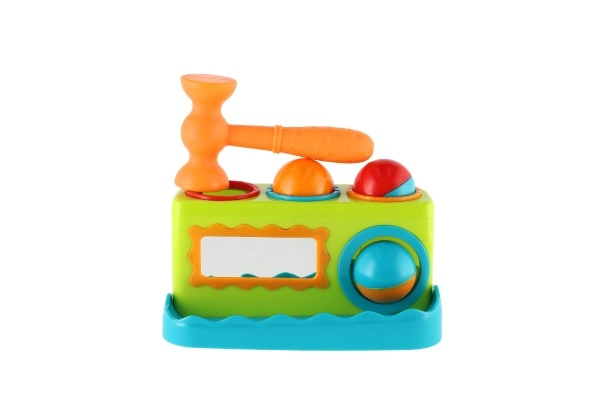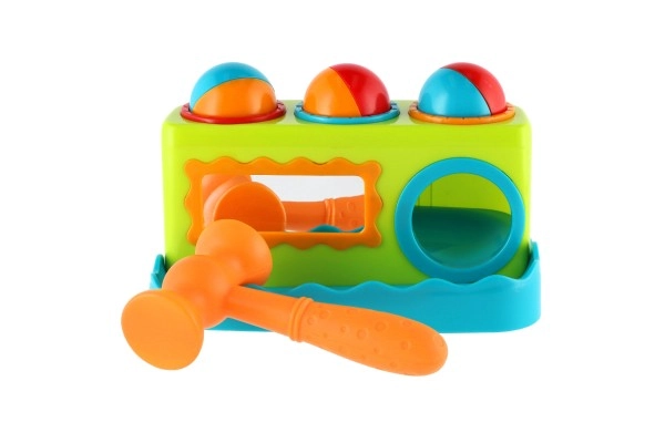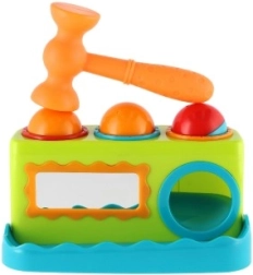Това цветно пластмасово чукче с дължина 21 см е чудесен избор за първи развиващи игри. Децата безопасно набиват три топчета в подготвените отвори с чукчето, като така тренират захват, сила и точност. Интегрираното огледалце на предната страна повишава взаимодействието и забавлението.