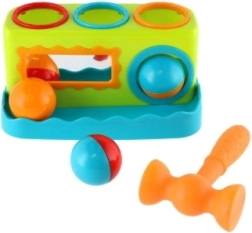 Пъстро чукче за най-малките развива фината моторика, координацията око–ръка и естественото любопитство. Децата с помощта на лекото чукче набиват три цветни топчета в отворите и наблюдават как падат. Предното огледалце добавя игрив ефект, мотивира за повтаряне и подпомага осъзнаването на собствения образ. Идеална първа дидактическа играчка от 12 месеца.