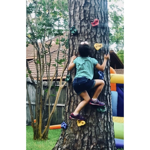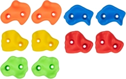 Създайте у дома или в двора безопасна детска катерачна стена за няколко минути. Цветните хватки от издръжлив PP материал са неслизгащи, устойчиви на UV и на атмосферни условия, с лесен монтаж с помощта на включения крепеж. Комплектът от 10 камъка и 2 здрави дръжки развива координационни умения, сила и пъргавина и насърчава активното движение на децата навън и у дома.