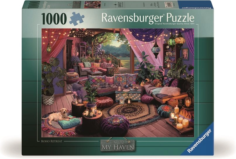 Ravensburger Пъзел Моето уютно бохо убежище с 1000 части гарантира часове забавление за всички любители на пъзели. Идеален за релакс и бягство в собствения ви уютен бохо свят.