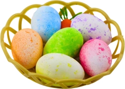 Този красив великденски комплект, състоящ се от цветни яйца с деликатни пръски и стилов пластмасов морков, поставени в пластмасова кошничка с детайлен дизайн, е перфектен за създаване на пролетна атмосфера. Яйцата са изработени от лека и издръжлива стиропорена пяна, а пластмасовата кошничка осигурява стабилност и лесна поддръжка.