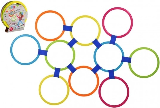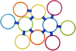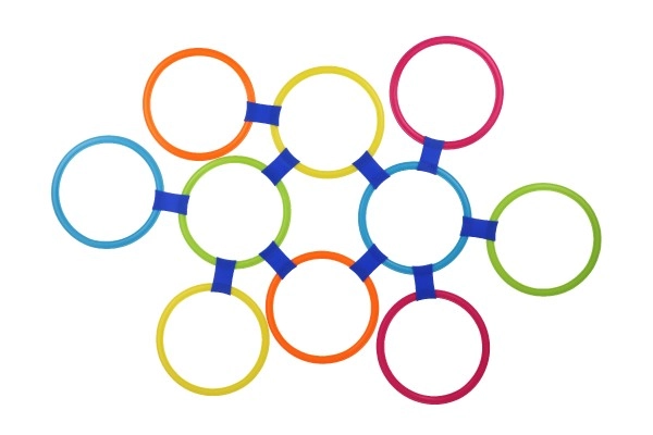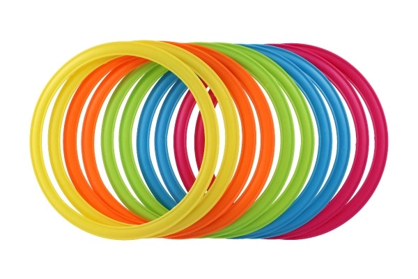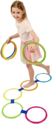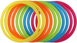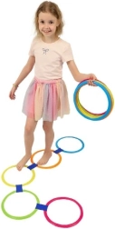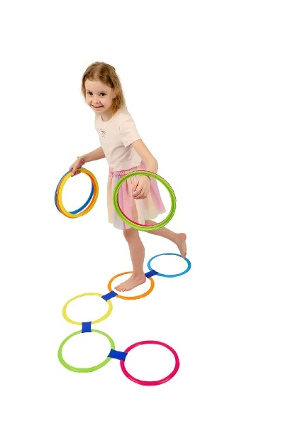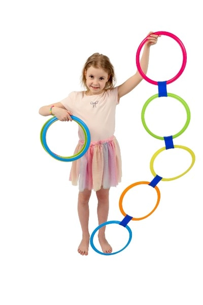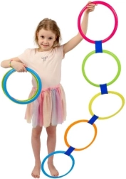Този пъстър комплект съдържа 10 обръча в пет цвята и 10 практични съединителя, с които лесно можете да свързвате обръчите в най-различни форми – трасета, препятствия, „дъска за дама“ или цел за хвърляне. Обръчите са отлични за игри навън и на закрито и мотивират децата към активност.