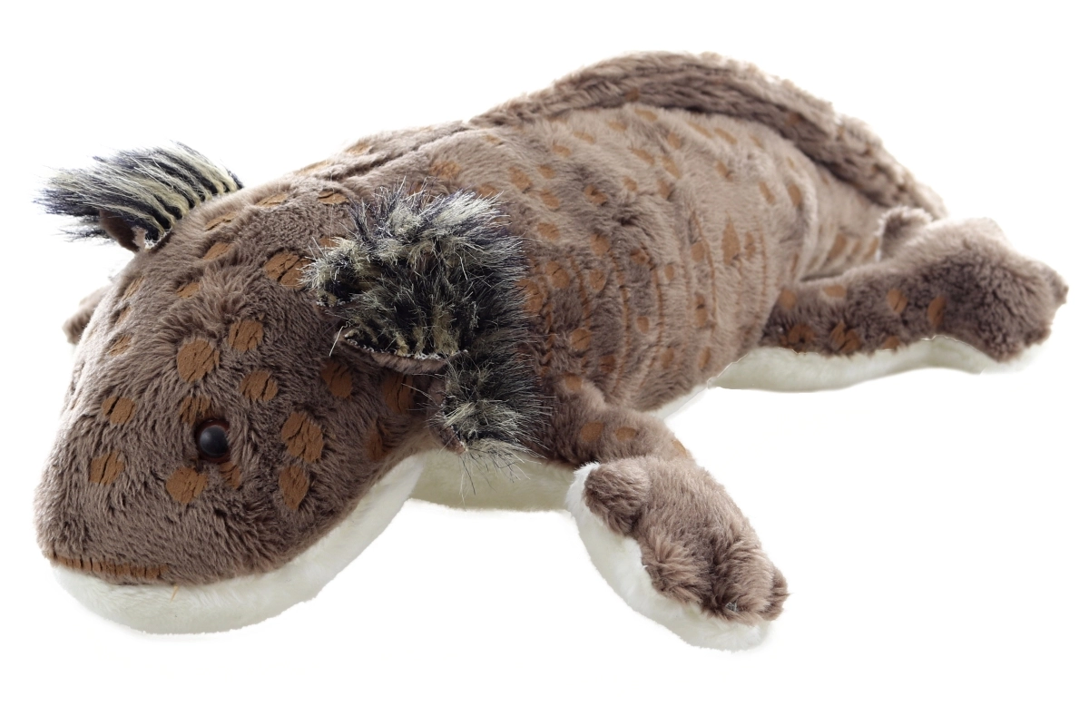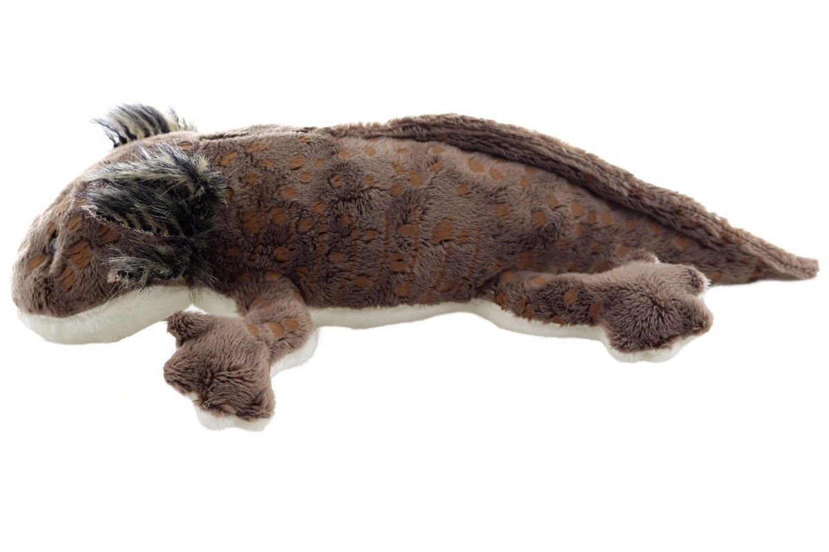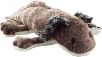 Този кафяв плюшен аксолотъл ще зарадва малки и големи любители на животните. Мекото тяло с фин косъм и изразителни петънца изглежда реалистично, като същевременно остава изключително нежно и приятно на допир. Благодарение на компактния размер 28 см е идеален за леглото, количката и за път.