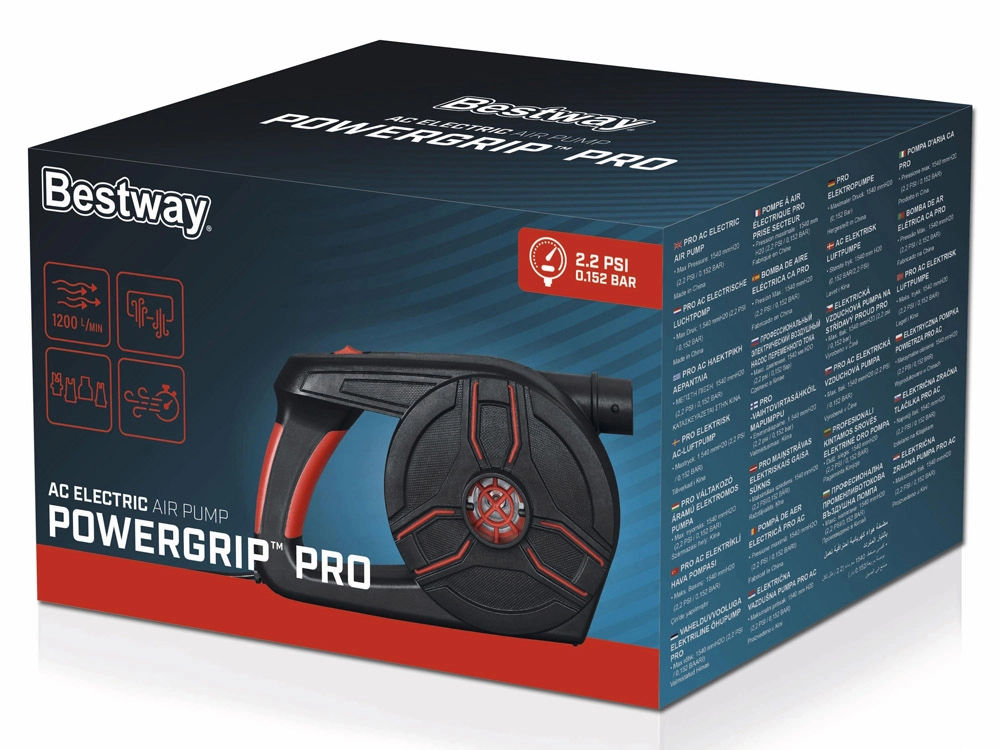 Практична електрическа помпа Bestway Powergrip Pro AC за бързо надуване и изпускане у дома и по време на път. Предлага мощен дебит 1200 l/min, максимално налягане 2,2 PSI (0,152 bar), захранване от мрежов контакт 220 V и 4 универсални накрайника за повечето надуваеми изделия.