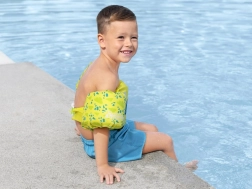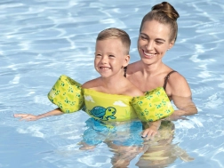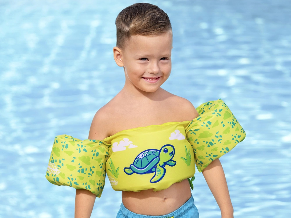 Търсите надеждно помощно средство за първите плувни стъпки? BESTWAY Puddle Jumper съчетава плувна жилетка и ръкавки в едно цяло, което помага на детето да поддържа правилна позиция във водата, без да ограничава движението. Веселият мотив с костенурка и ярките летни цветове мотивират децата и повишават видимостта във водата.