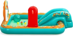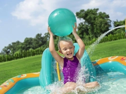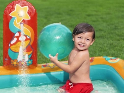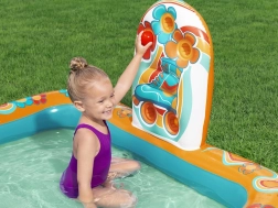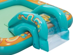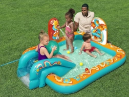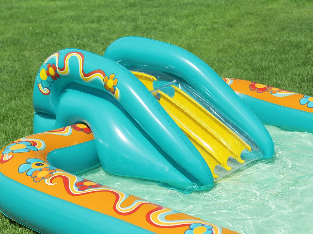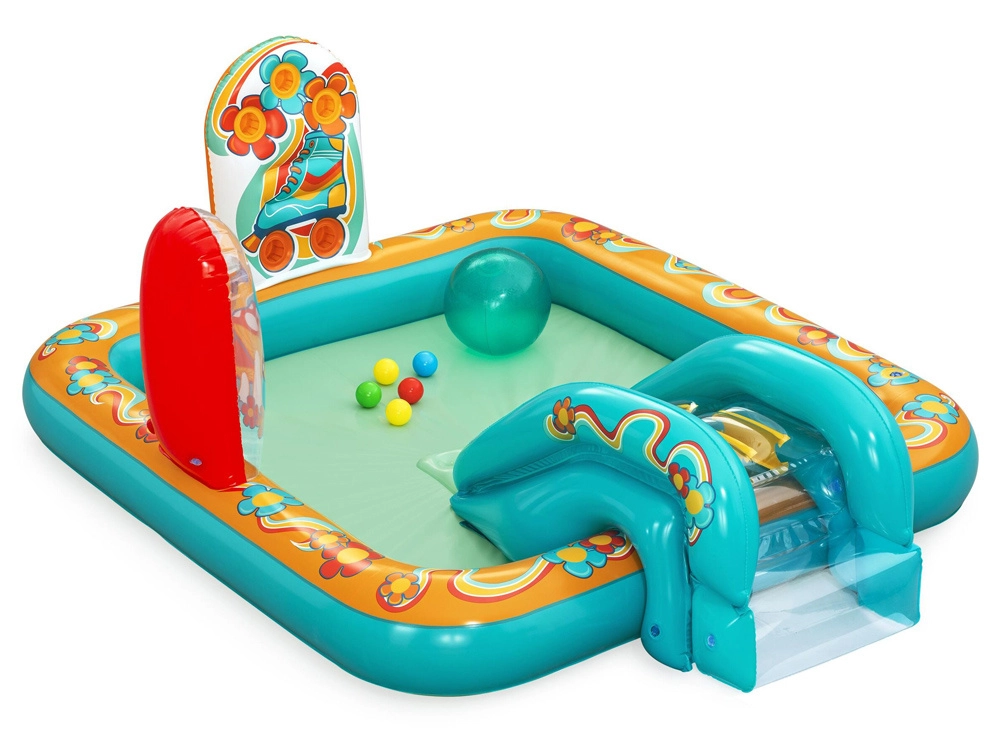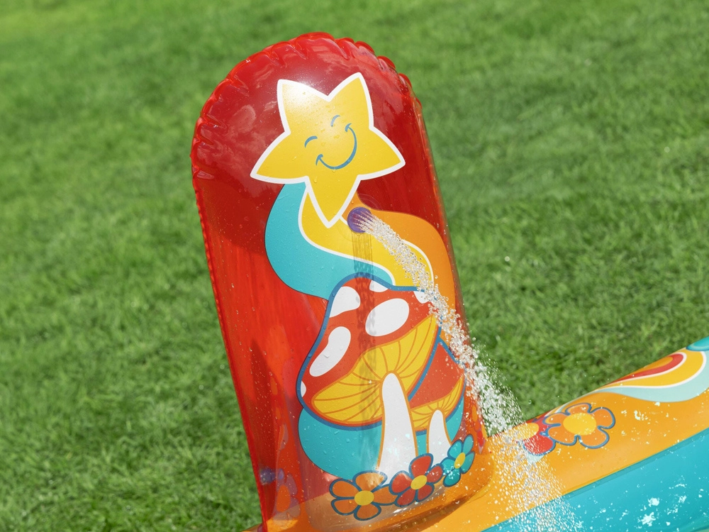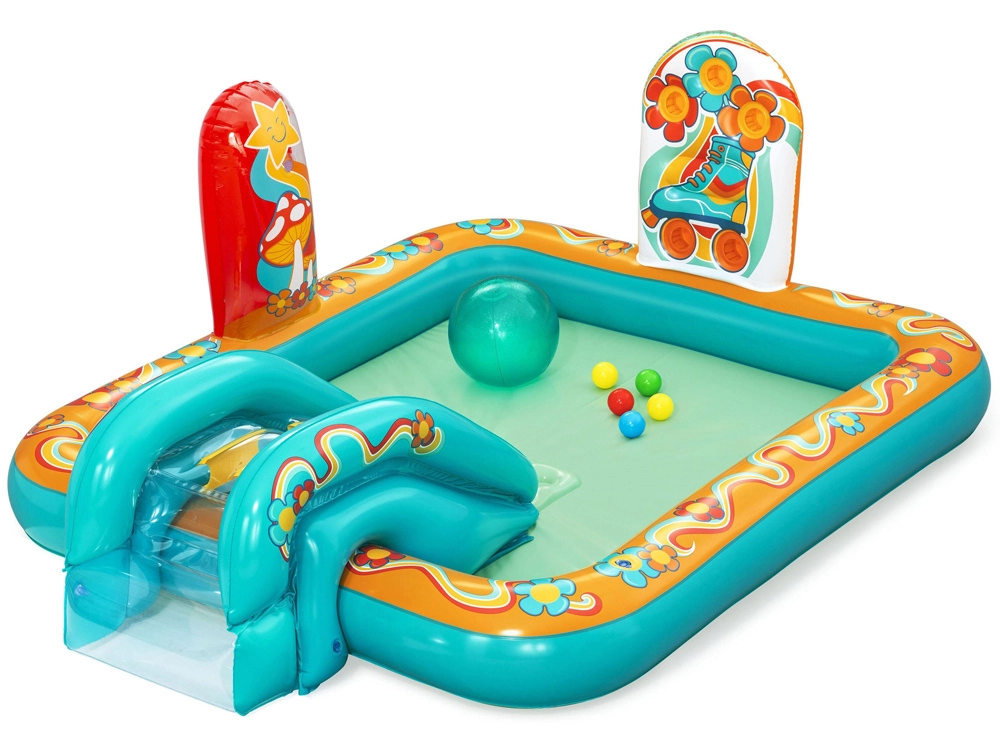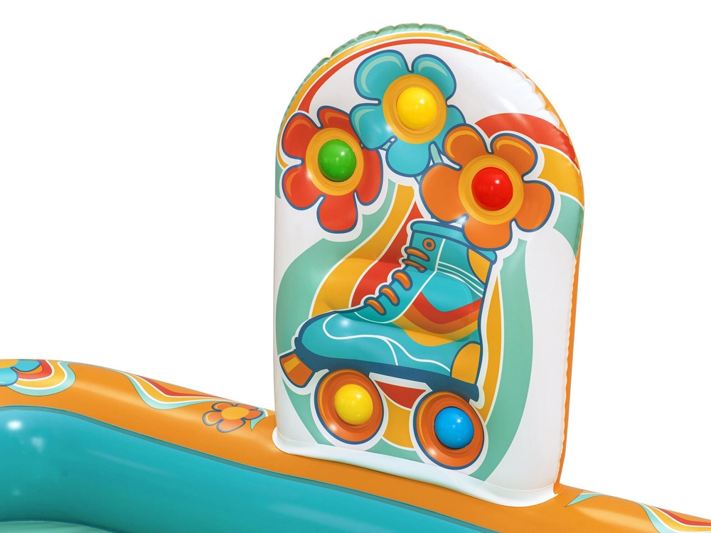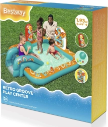 Надуваемото игрално център BESTWAY Retro Groove превръща вашата градина в пъстра водна площадка. Стабилната пързалка, здраво фиксирана към дъното, води към плитък басейн, а за освежаване се грижи водната пръскачка, която лесно свързвате към маркуч. Ретро графиката и аксесоарите като топчета и плажен балон насърчават креативната игра и развитието на моториката.