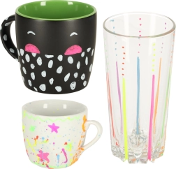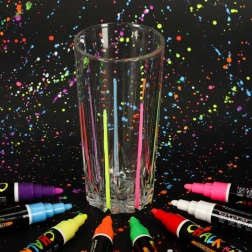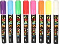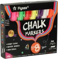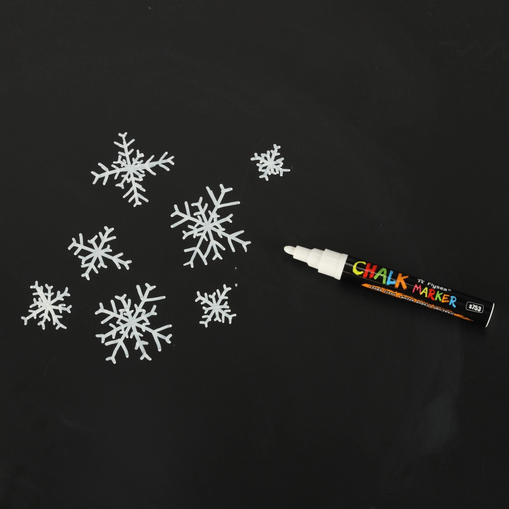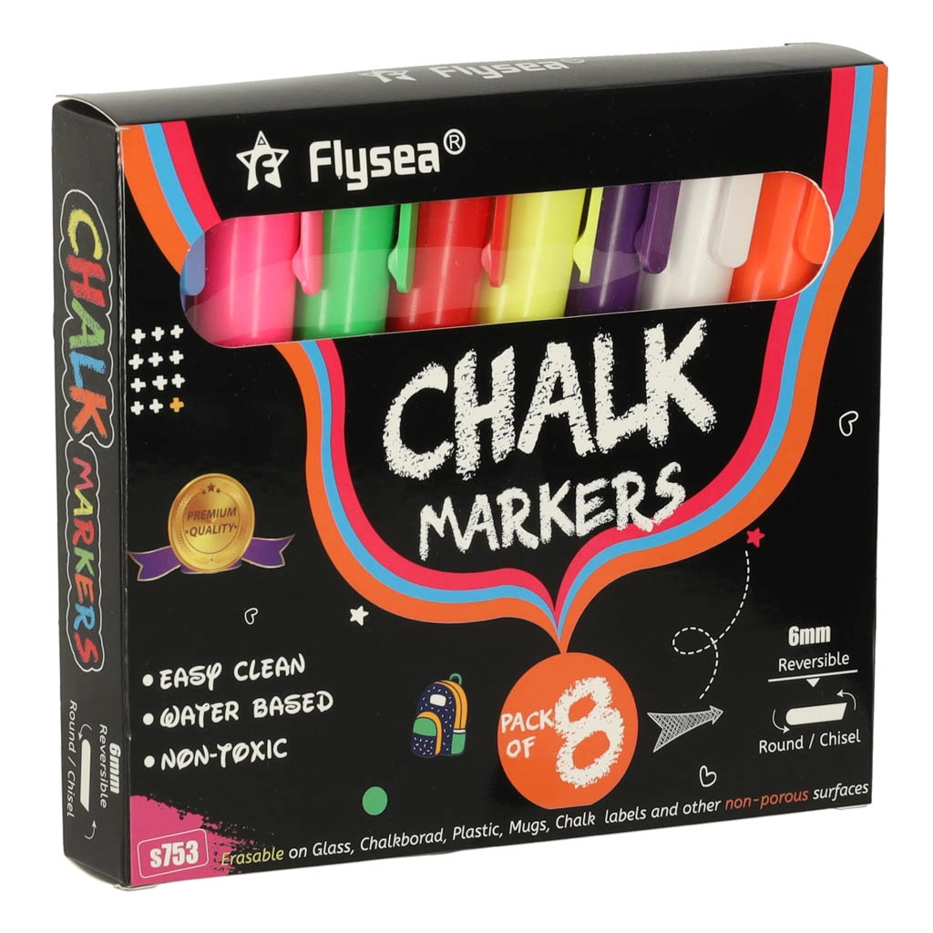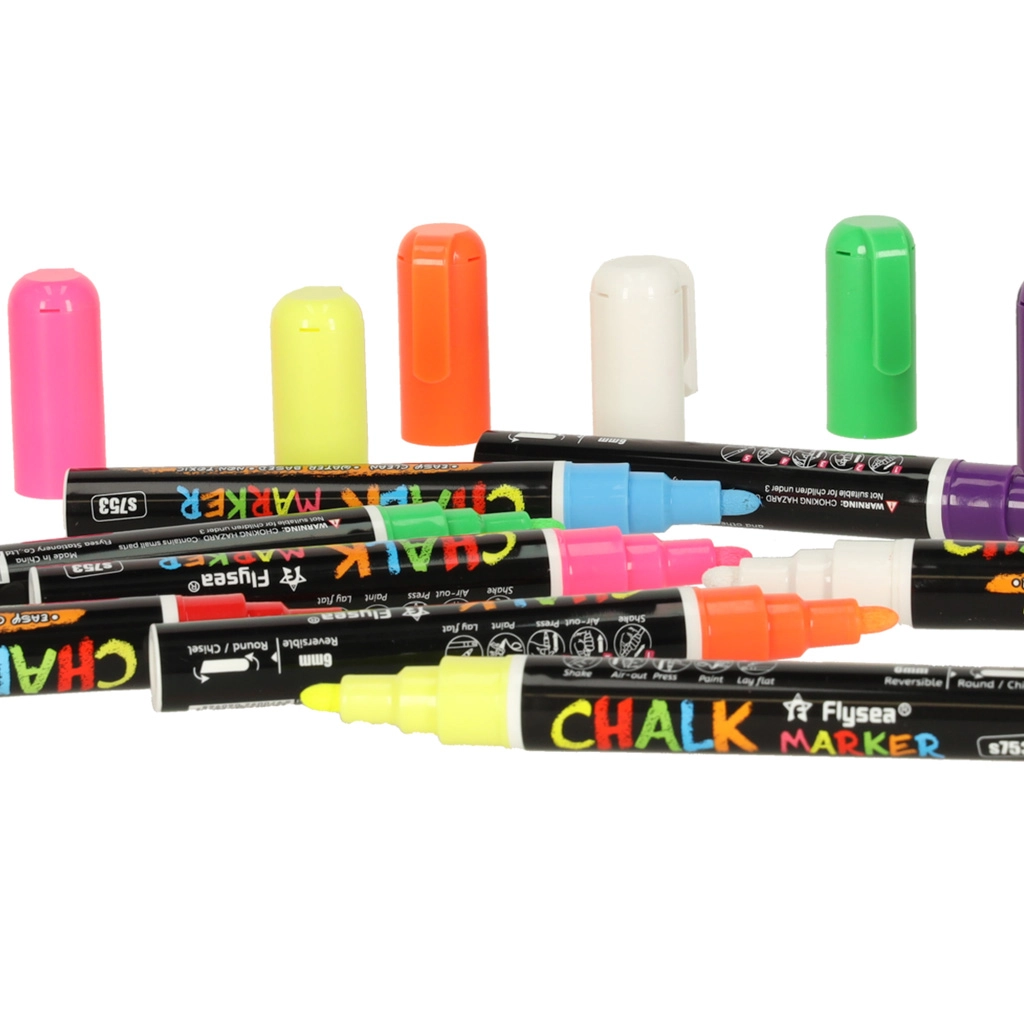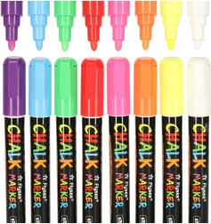 Всеки маркер има двустранен връх (кръгъл и скосен), който може да се обръща при нужда, осигурявайки прецизност и разнообразие на линиите. Мастилото на основата на тебешир и вода не оставя следи; достатъчно е да използвате влажна кърпа за премахването му – без размазване и остатъци. Освен това не цапа ръцете и не образува прах като традиционния тебешир.