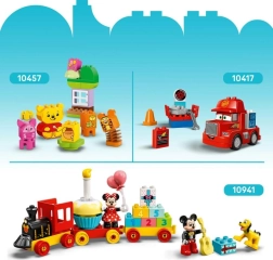 Включва фигура LEGO DUPLO на мишока Мики и неговия умен помощник Косик, емблематичната червена кола и цветни тухлички за лесно и безопасно строене. Дигитална версия на инструкциите е налична в приложението LEGO Builder. Комплектът е тестван за безопасна игра и е чудесен подарък за малки почитатели на превозни средства и историите за Мики.