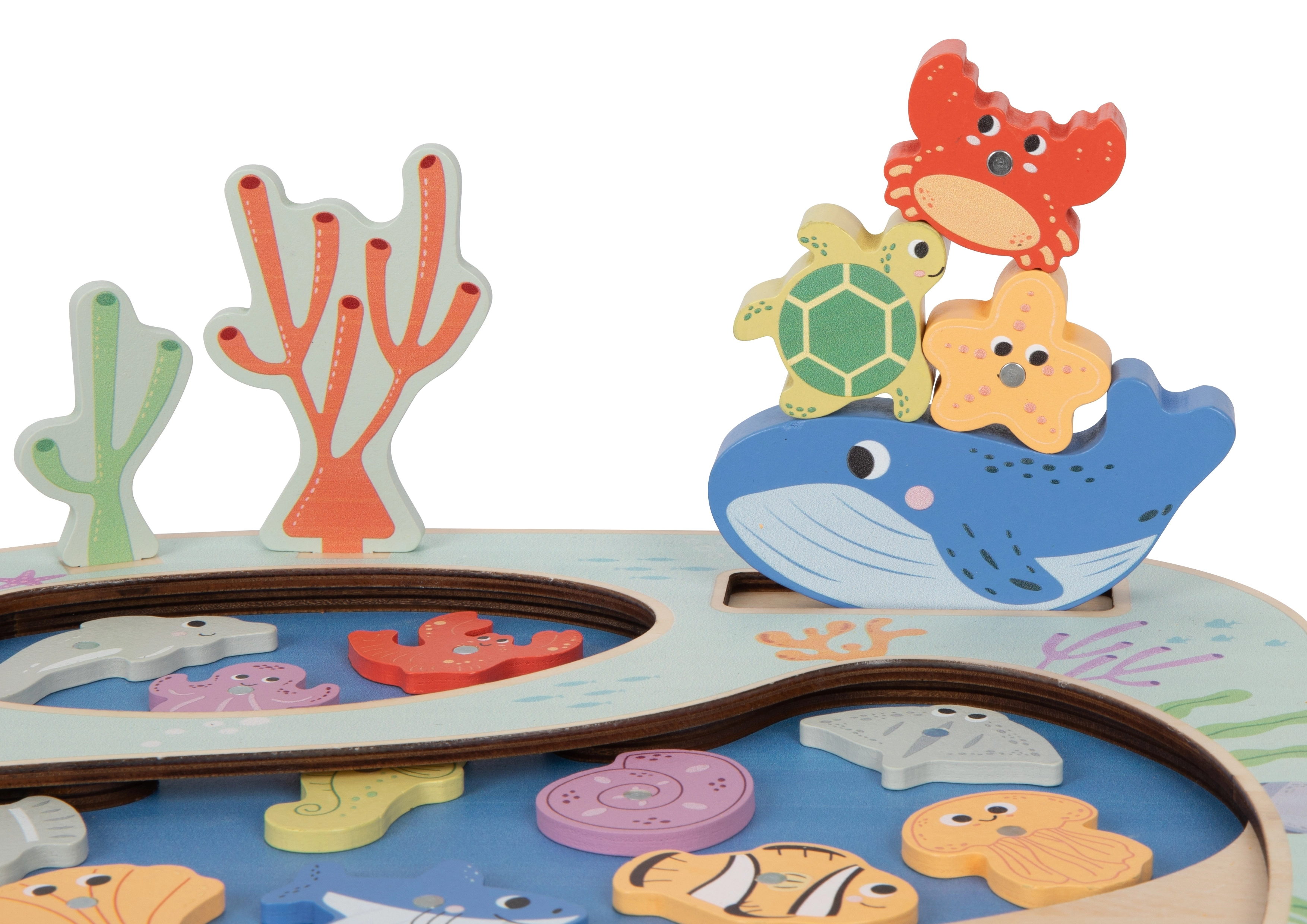 Съдържа 22 части: дървена дъска, морски животни и две магнитни въдици.