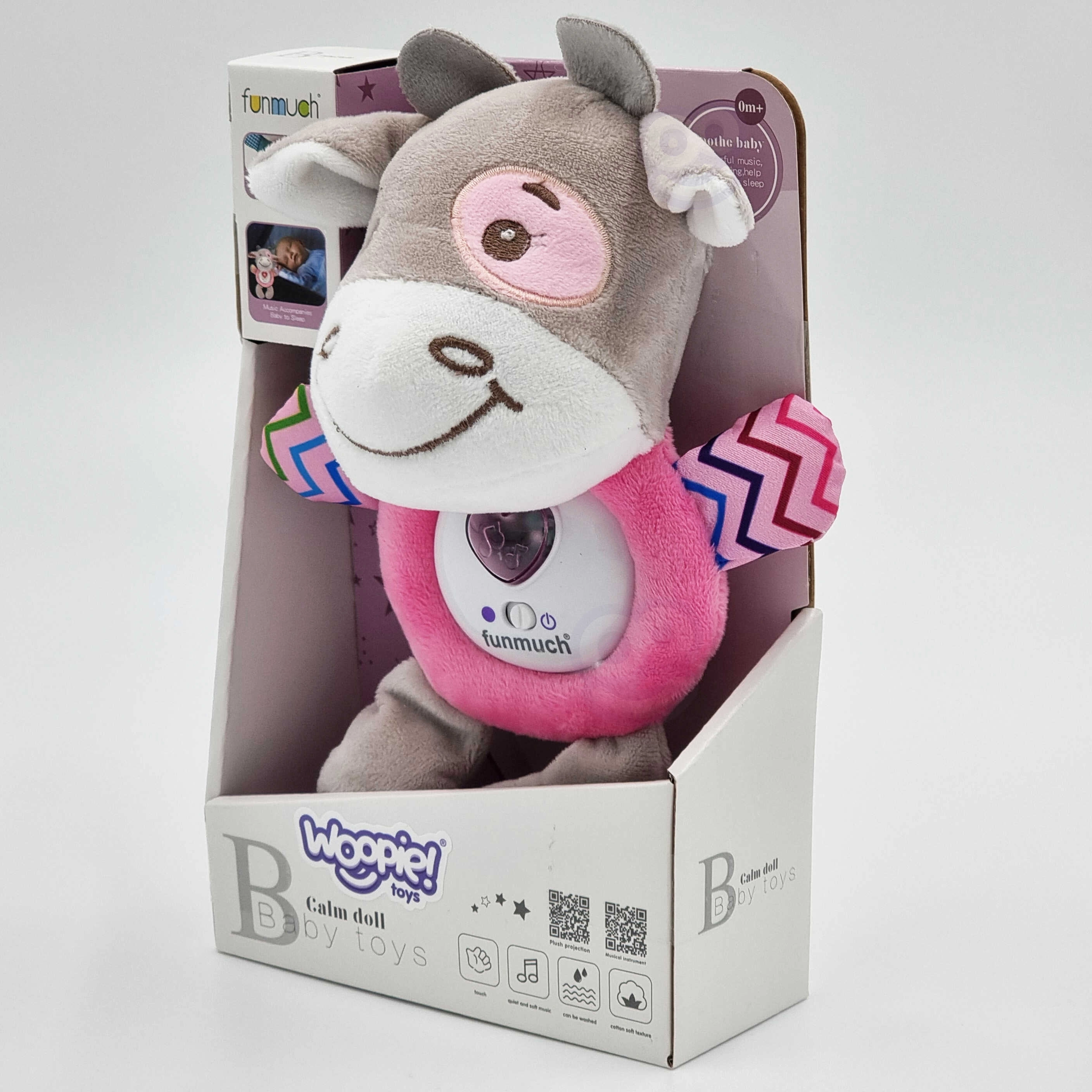 Благодарение на меката материя и пълнежа от вата, тази играчка е идеална за кърмачета. Не е нужно да се притеснявате, че вашето мъниче може да се нарани. Играчката се почиства лесно и безопасно – достатъчно е да се извади механизмът. Идеална е като плюшена играчка за приспиване, осигурява светлинни и звукови ефекти. Допълнително предимство е възможността за демонтаж на механизма при пране.