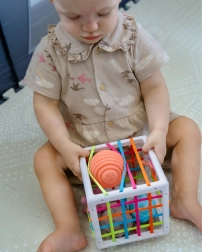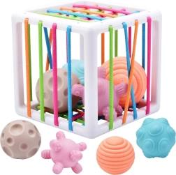 Това сензорно кубче с еластични ленти е идеалният помощник за деца, които обичат да откриват света чрез допир. Меките форми с различни повърхности се хващат лесно, стискат се и се промушват през еластичните ленти. Играта естествено развива фина моторика, осезание и координация, като едновременно укрепва търпението и логическото мислене.