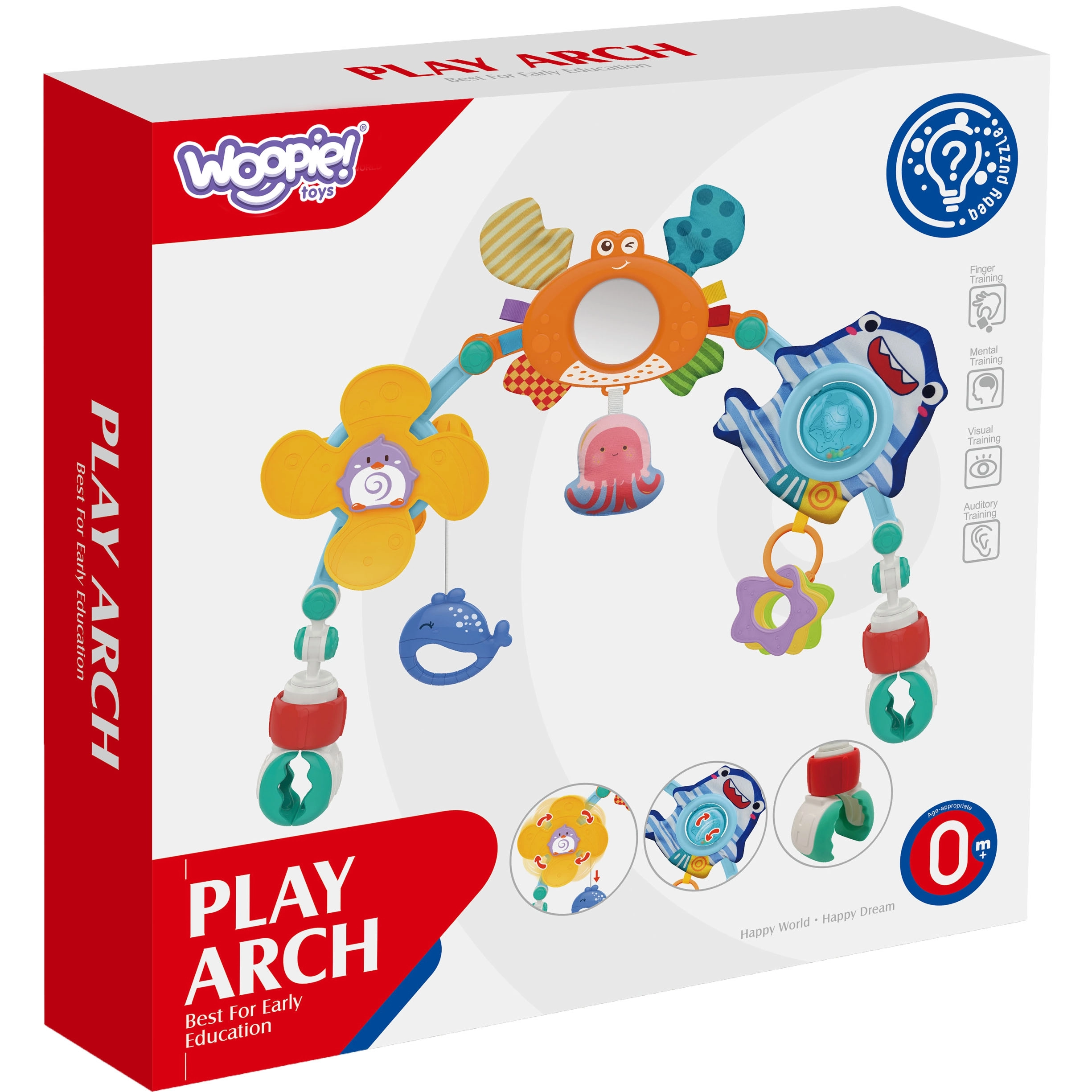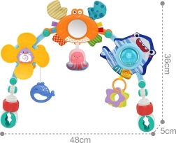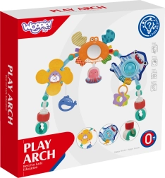 Играчката-арка с играчки от марката Woopie е идеално решение за забавление и развитие на вашето бебе. Тази цветна арка е оборудвана с различни играчки, вдъхновени от морския свят, като ветрило с пингвин, раче-огледалце, октоподче, акула-тракалка и делфин висулка. Играчките насърчават взаимодействието на детето и подпомагат развитието на сетивните и моторните умения.
