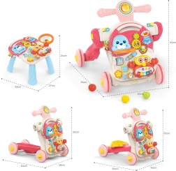 Тази играчка е истинска съкровищница от изненади, които детето може самостоятелно да открива. Комбинацията от няколко функции в една играчка – проходилка, тротинетка, яздилка и образователна масичка – гарантира, че интересът към нея ще се запази дълго.