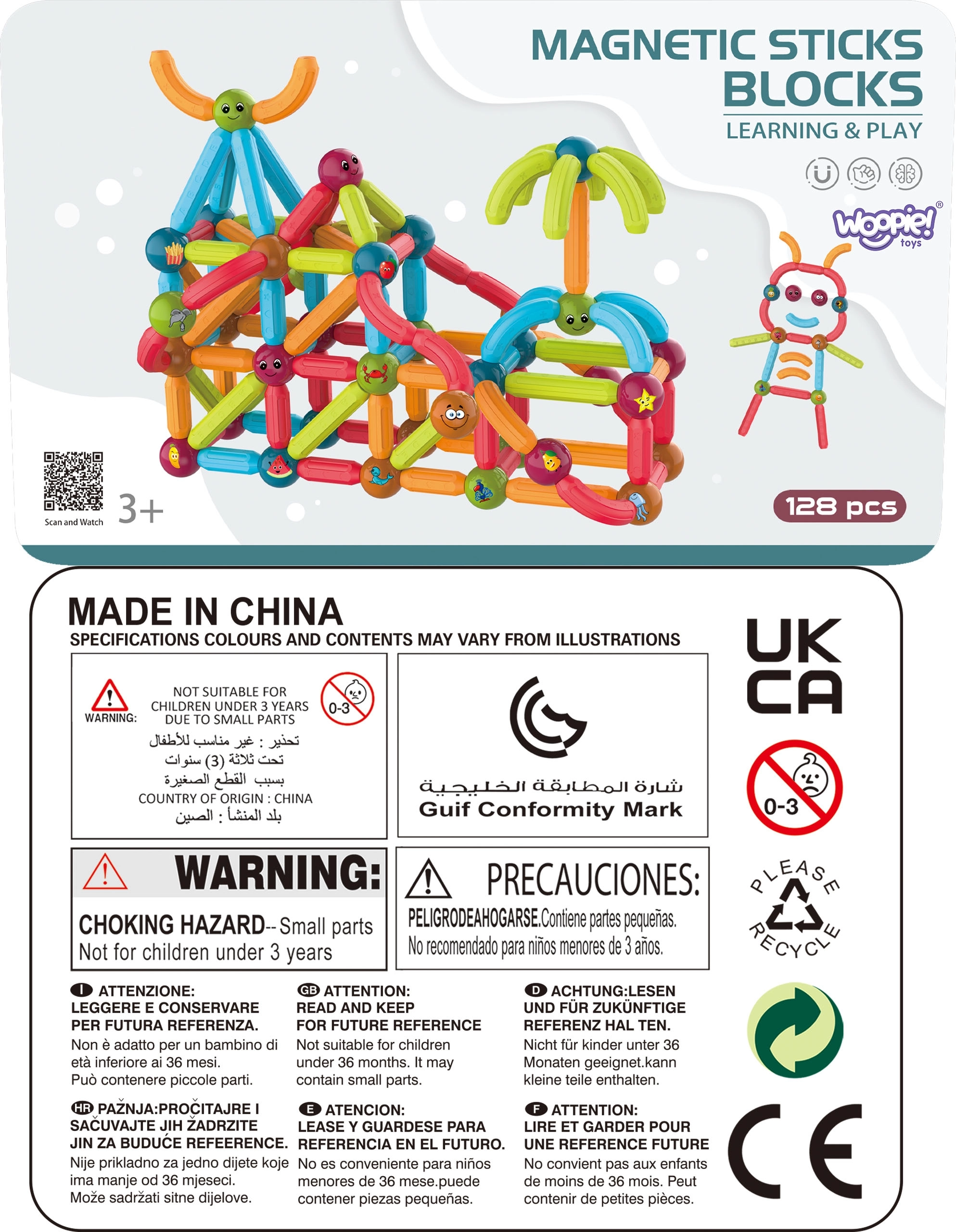 Открийте креативния свят с магнитния конструктор WOOPIE със 128 части, който съчетава забавление и учене. Благодарение на големите, силни и безопасни елементи децата лесно изграждат 3D конструкции, геометрични форми и мини къщичка. Конструкторът развива фината моторика, пространственото мислене, креативността и концентрацията, като едновременно с това учи азбуката, броенето и формите. В комплекта има и карта с модели и практична преносима кутия.
