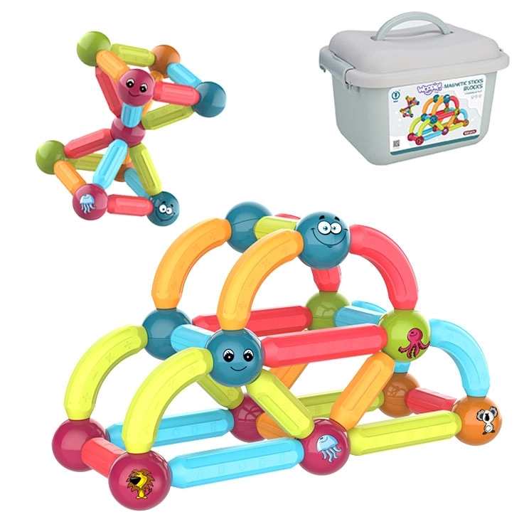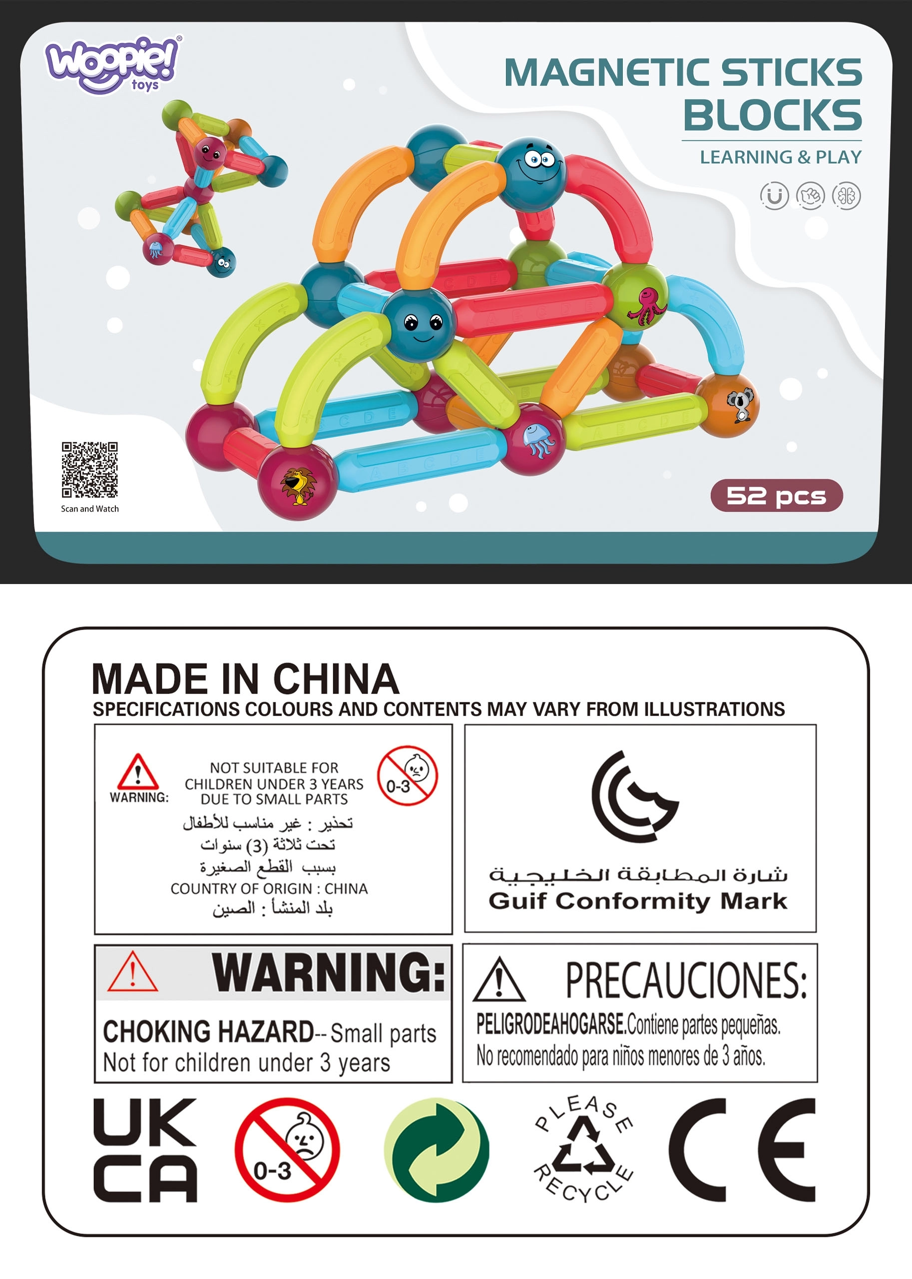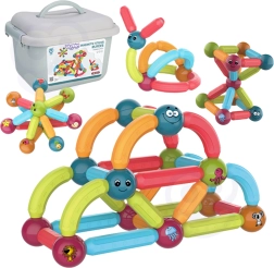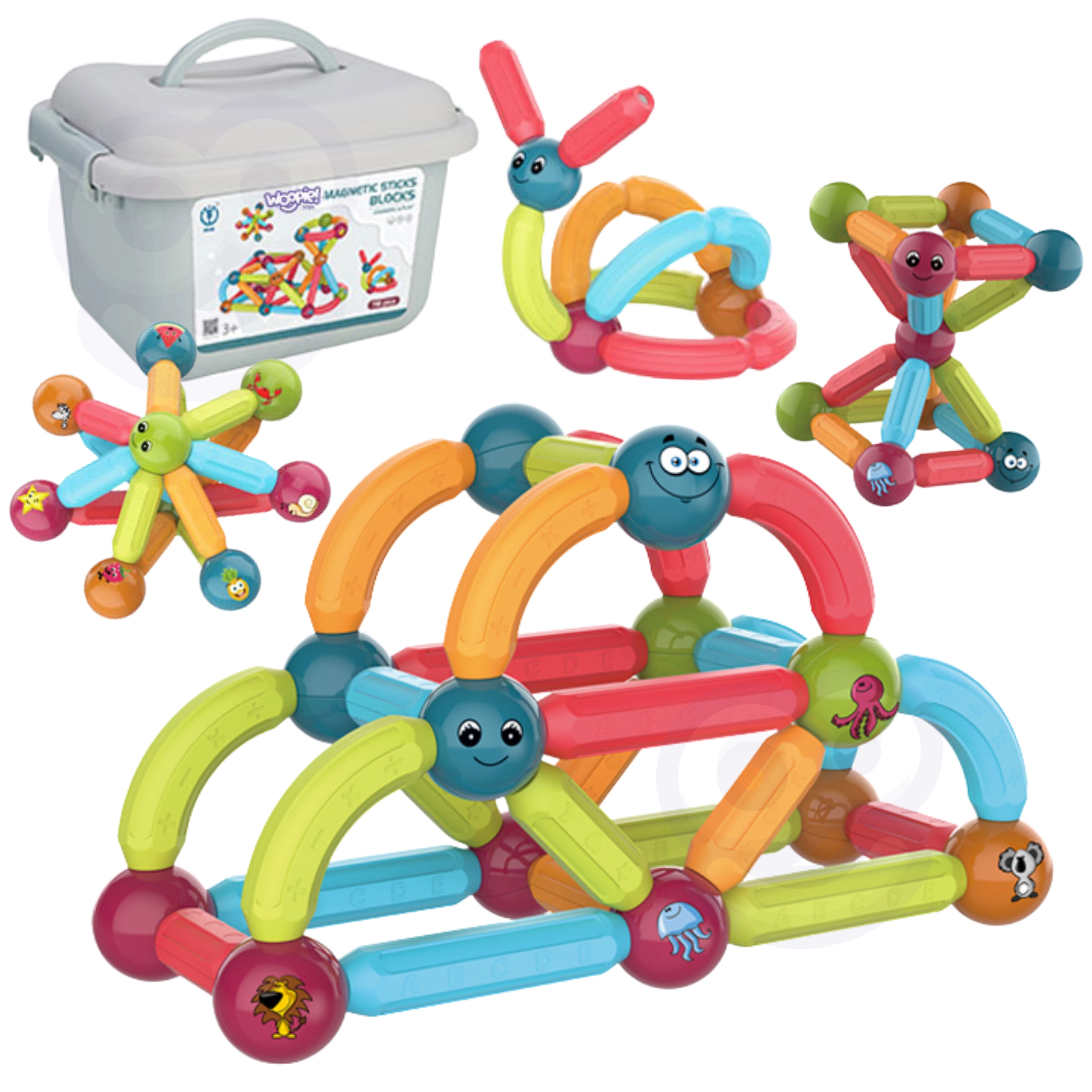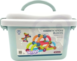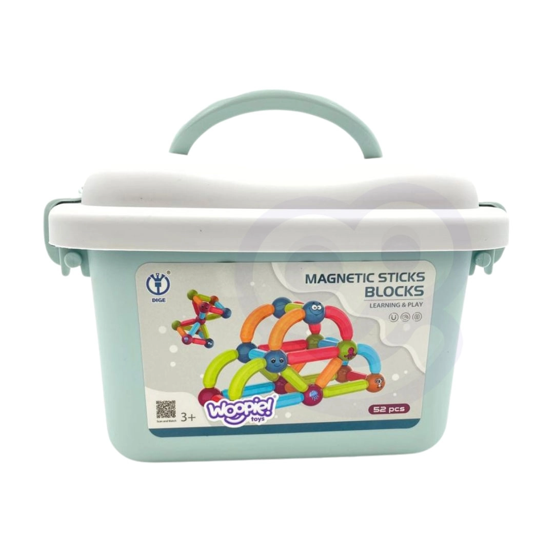 Забавление и учене се съчетават в магнитните конструктори на марката Woopie! Комплектът съдържа 52 цветни и безопасни елемента, идеални за малки ръчички, които позволяват строене на различни видове конструкции.