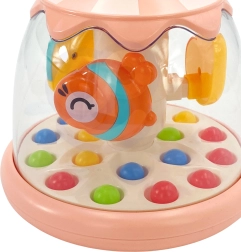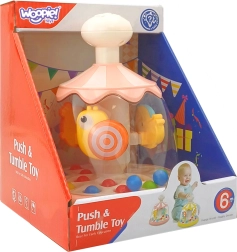 Весел розов въртящ се пумпал с животни от марката WOOPIE ще зарадва бебетата още от 6 месеца. При натискане на горния бутон животните се завъртат, а цветните топчета започват да подскачат като на малка атракция тип въртележка. Играчката осигурява визуална и звукова стимулация, подпомага фината моторика и координацията ръка–око. Изработена е от безопасни и устойчиви материали за спокойно ежедневие в игра.