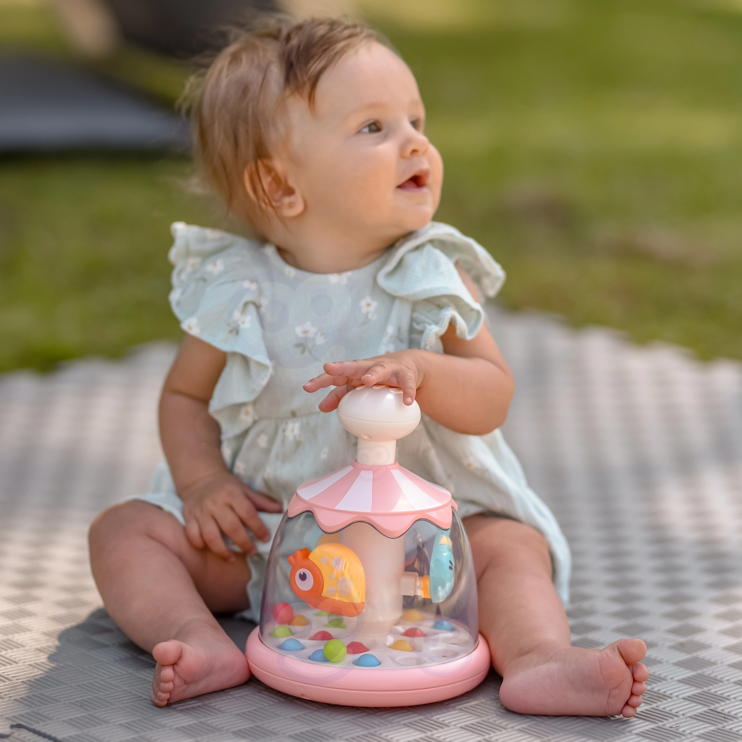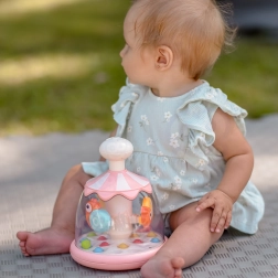 Открийте магията на простата интерактивна игра: достатъчно е да натиснете големия горен бутон и прозрачният купол се превръща в мини въртележка с животни и подскачащи топчета. Децата ще се радват на цветни ефекти, движение и нежни звуци, които естествено развиват сетивата им.
