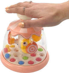 Големият горен бутон е идеален за малки ръчички. Само с едно натискане се завъртат животните и топчетата и се получава завладяваща мини въртележка.