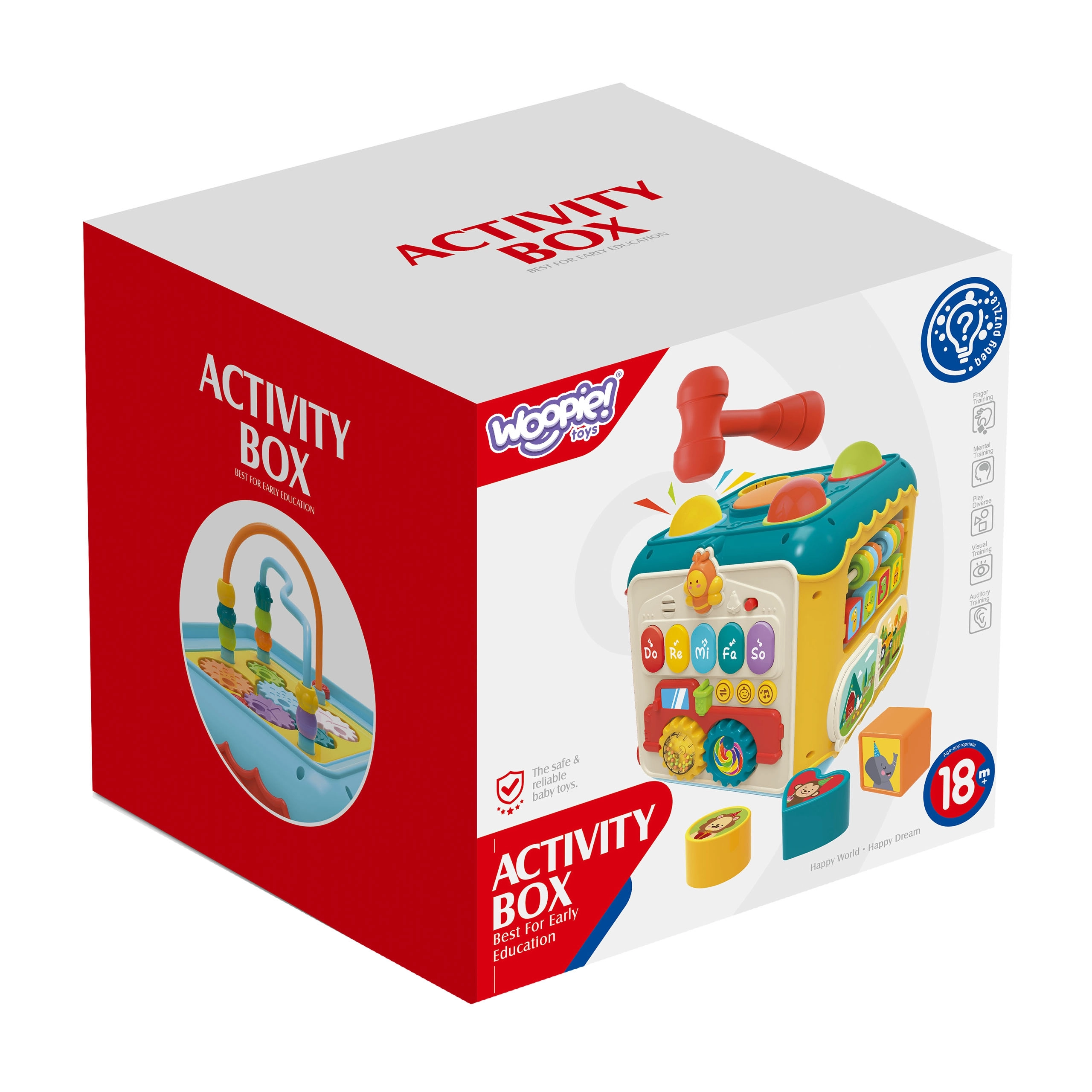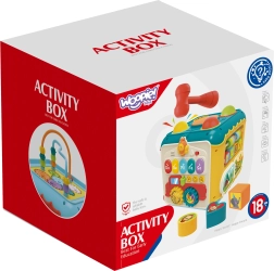 Многофункционалният активен куб 6в1 от марката WOOPIE носи на малките деца пъстро забавление и учене в едно. Всяка страна предлага различна активност – пиано със звуци, забиване на топчета с чукче, лабиринт, сортер за форми с вратичка и ключалка, преплитане и часовник с дрънкалка. Играчката развива фината моторика, координацията око–ръка, разпознаването на цветове, форми и звуци и подкрепя любопитството и креативността. Компактните размери гарантират лесно пренасяне и безкрайно забавление у дома и в движение.