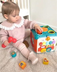 Открийте игриво и образователно занимание за най-малките с куба WOOPIE 6в1. Всяка стена носи различен начин на учене чрез игра: от звуковото пиано и забиването на цветни топчета до логическото сортиране на форми. Децата естествено развиват фината моторика, сензорното възприятие и въображението при взаимодействие с елементите.
