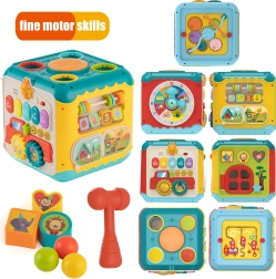 - 6 в 1 (пиано, забиване на топчета с чукче, сортер за форми и вратичка с ключалка, лабиринт, преплитане, часовник с дрънкалка)