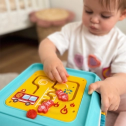 Всяка страна предлага различно забавление – пиано, забиване на топчета, сортер, лабиринт, преплитане и часовник с дрънкалка. Идеално за разнообразна игра и учене.