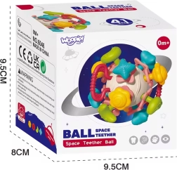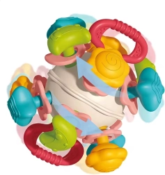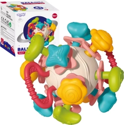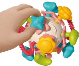 Благодарение на компактната форма топката се хваща лесно, развива фината моторика и учи детето да разпознава форми, цветове и структури. Издръжливите материали без остри ръбове и възможността за лесно миене я правят идеален избор за ежедневна игра у дома и по време на път.