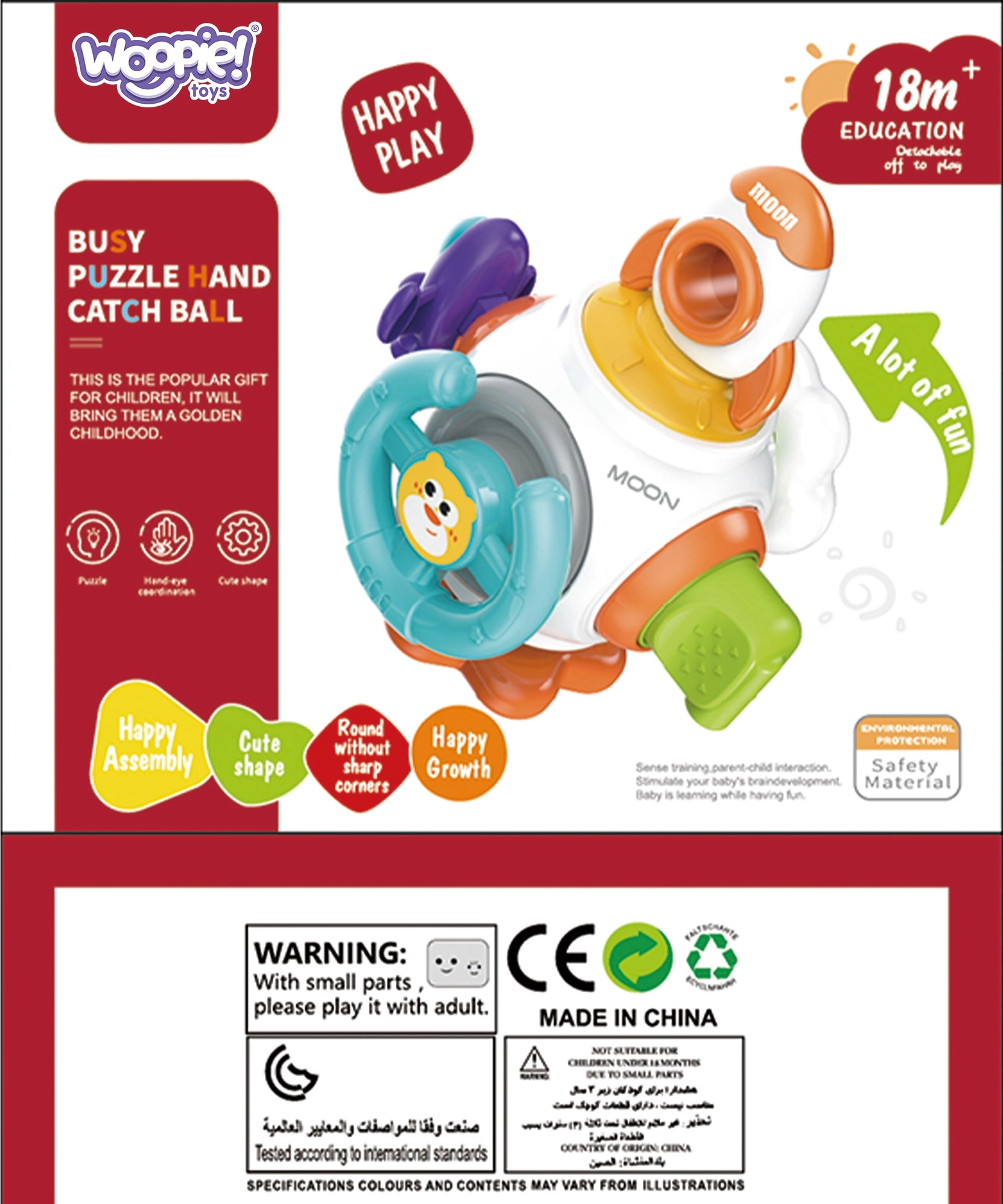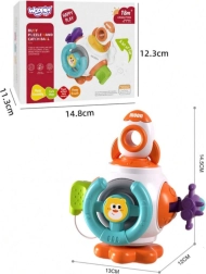 Космическата ракета Монтесори от марката WOOPIE е цветна, образователна сензорна кубче, предназначена за деца от 18 месеца. Съдържа шест активни панела, които стимулират сетивата и развиват двигателните умения на детето, с елементи като волан, бутон облак и ракетни играчки.
